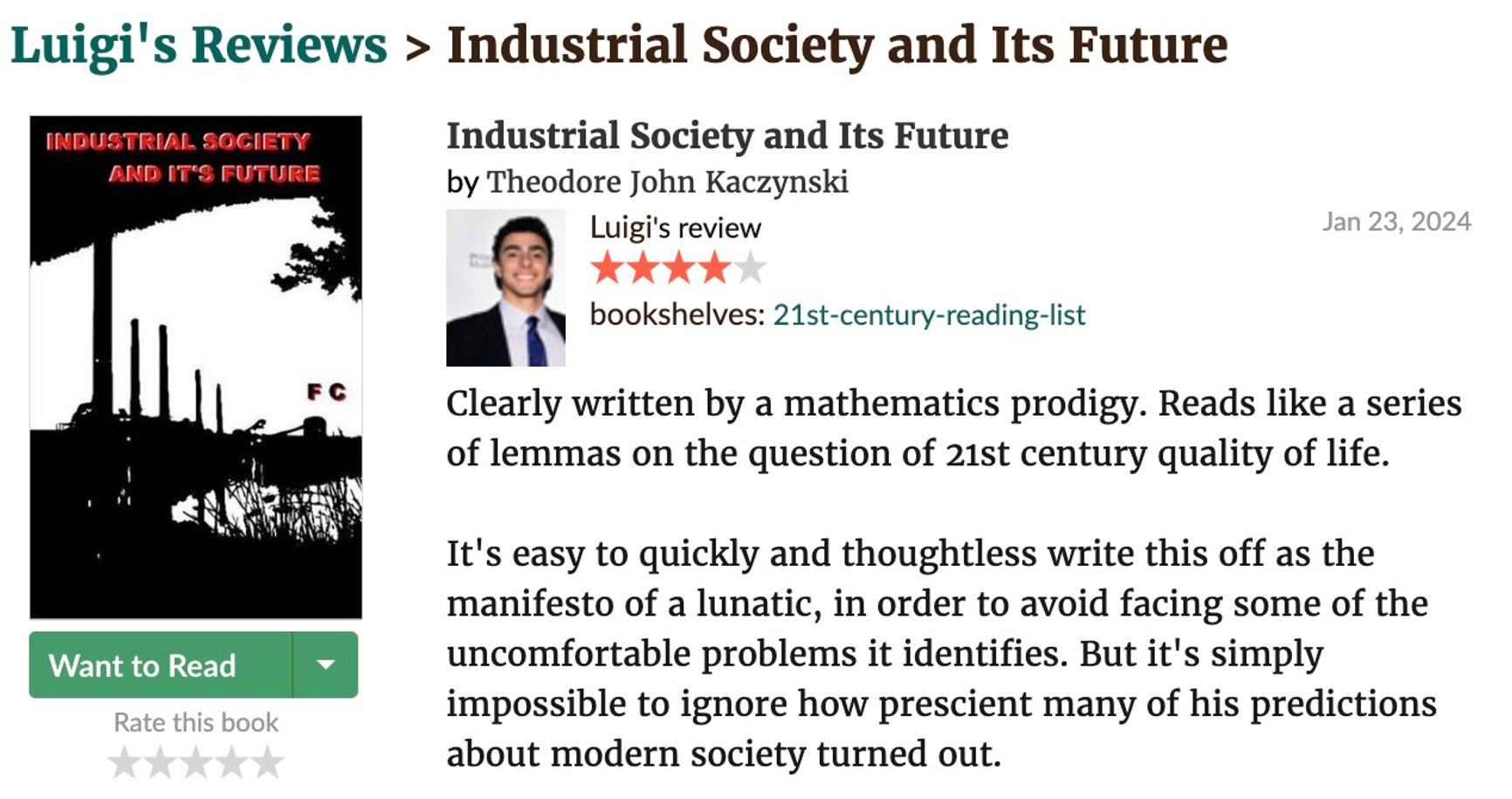 Фрагмент рецензии Луиджи Манджионе на «Манифест Унабомбера»