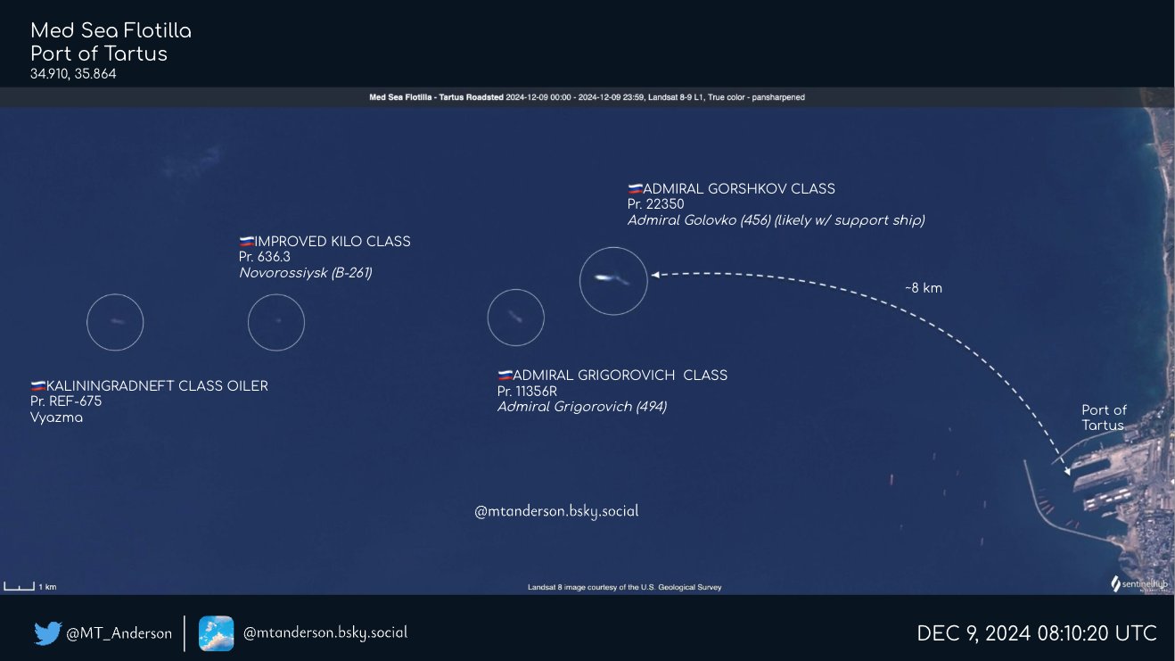 A Landsat satellite image confirms that Russia’s Mediterranean fleet is idling in a holding pattern approximately 8 kilometres west of the Port of Tartus. Photo: MT_Anderson / X (ex-Twitter)