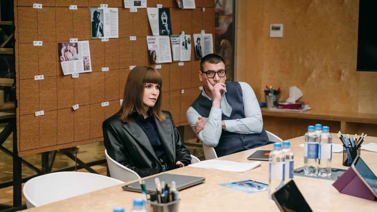 Действие сериала в том году и происходит, на что указывает появляющийся в кадре уже на четвертой минуте пилотной серии Минаев. Он берет интервью у экс-главреда русского Vogue Алены Долецкой о смерти глянца в России и серии отзы́вов лицензий у отечественных версий, затрагивая Condé Nast. Это именно март 2022-го года, хотя создатели, очевидно, намеренно расставили повсюду календари за 2024-й, и он же упоминается во время редколлегии в третьей серии. Такой ход дистанцирует сюжет от не вполне удобной хронологической проблематики и избавляет режиссера от нужды воссоздавать атмосферу психологической напряженности тех дней — и объяснять ее причины.