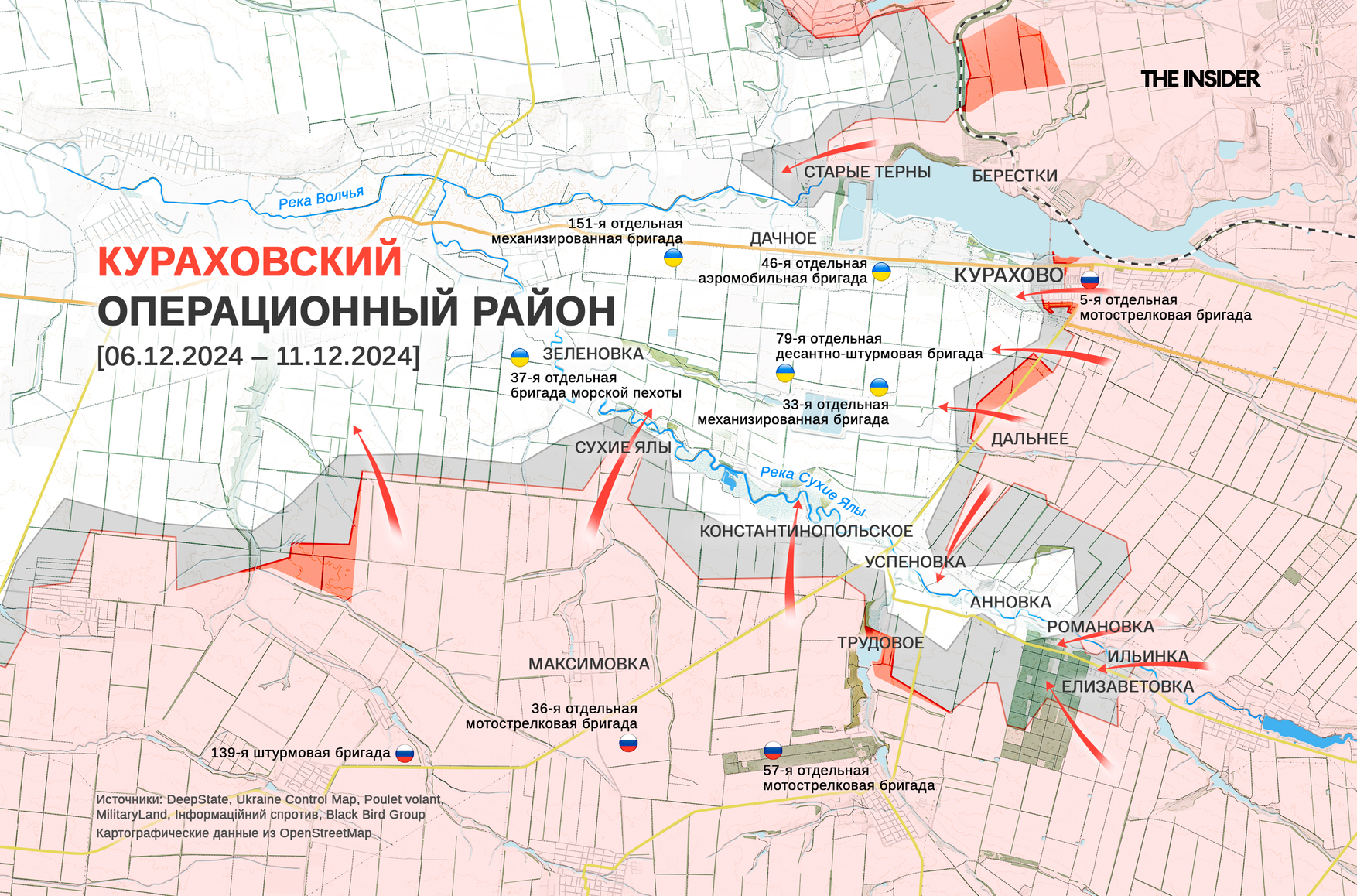 DeepState сообщает о продвижении ВС РФ в Кураховском операционном районе: в сторону поселка Разлив, около Сонцовки (до 2016 года — Красное) севернее Кураховского водохранилища и в самом Курахове. В то же время отмечается расширение зоны контроля ВСУ рядом с Константинопольским, лежащим рядом с «горловиной» занятого украинскими подразделениями «кармана» южнее Курахова (об отражении штурма на этом участке бойцами украинской 37-й ОБрМП мы писали накануне).