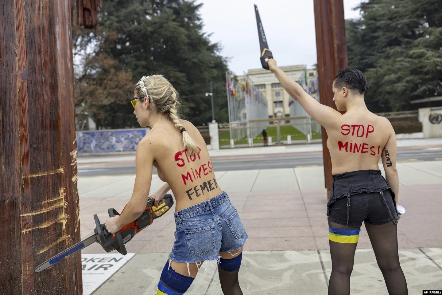 Активистки украинского движения FEMEN в пятницу, 13 декабря, провели акцию перед Дворцом Наций в Женеве, где находится европейская штаб-квартира ООН. Полуобнажённые акционистки бензопилой нанесли несколько видимых разрезов на скульптуру "Сломанный стул", которая символизирует последствия применения противопехотных мин.