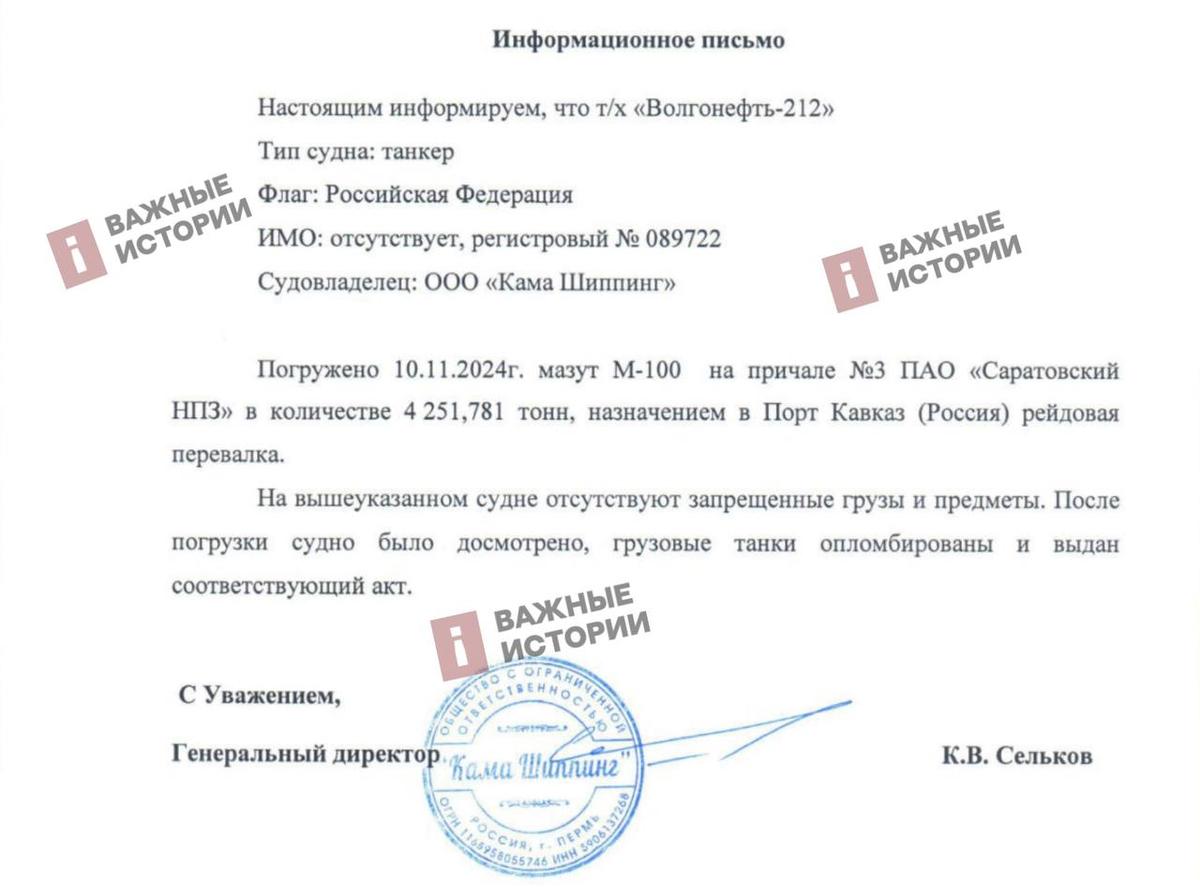 Танкер «Волгонефть-212» в последние полгода дважды загружался мазутом на «Саратовском НПЗ», согласно документам, которые изучили «Важные истории».