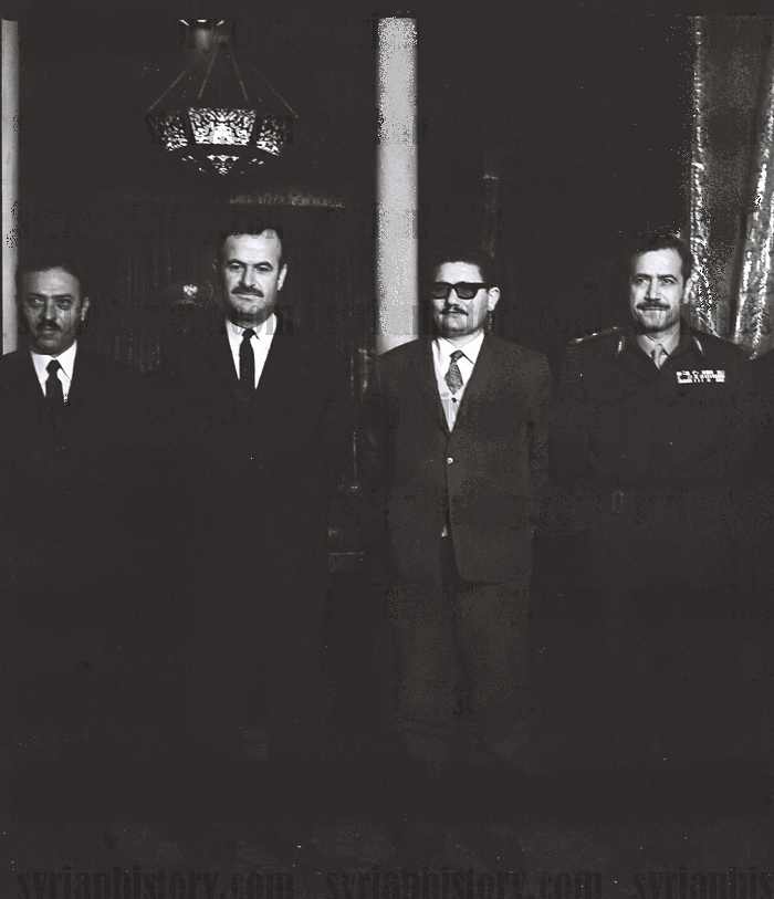 Асад (второй слева) вместе с соратниками из суннитской общины Сирии: Ахмадом аль-Хатибом, Абдуллой аль-Ахмар и Мустафа Тлас