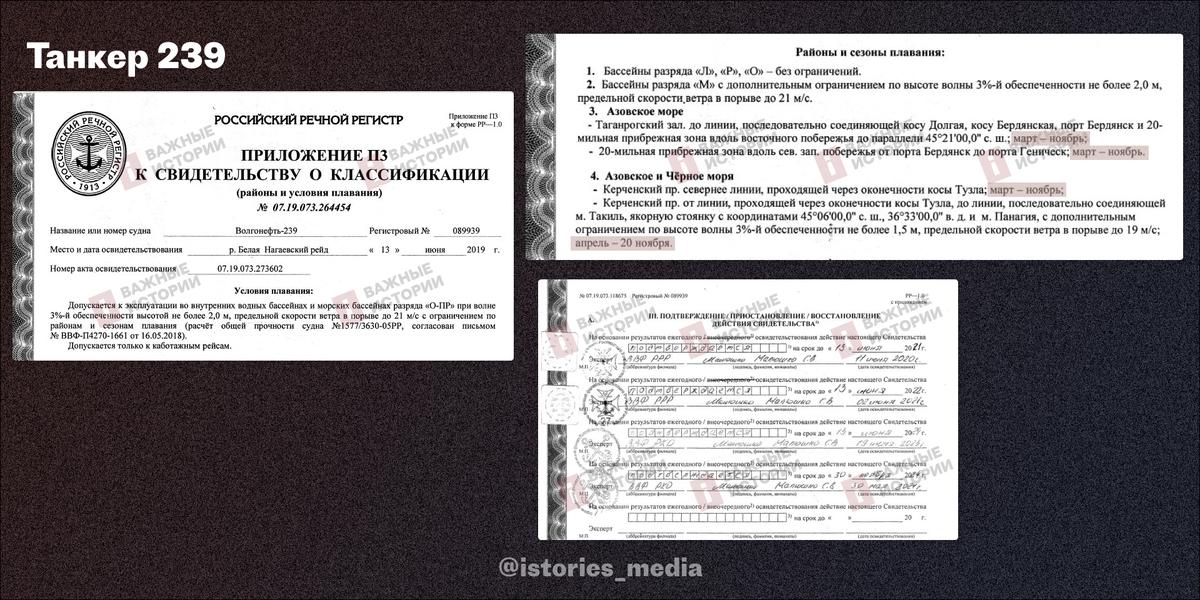 Согласно документам, танкеры не могли выходить в Керченский пролив в декабре. Классификационные свидетельства, выданные РКО, разрешают судам заходить в пролив не позже ноября при соблюдении предельной скорости ветра и высоты волны.
