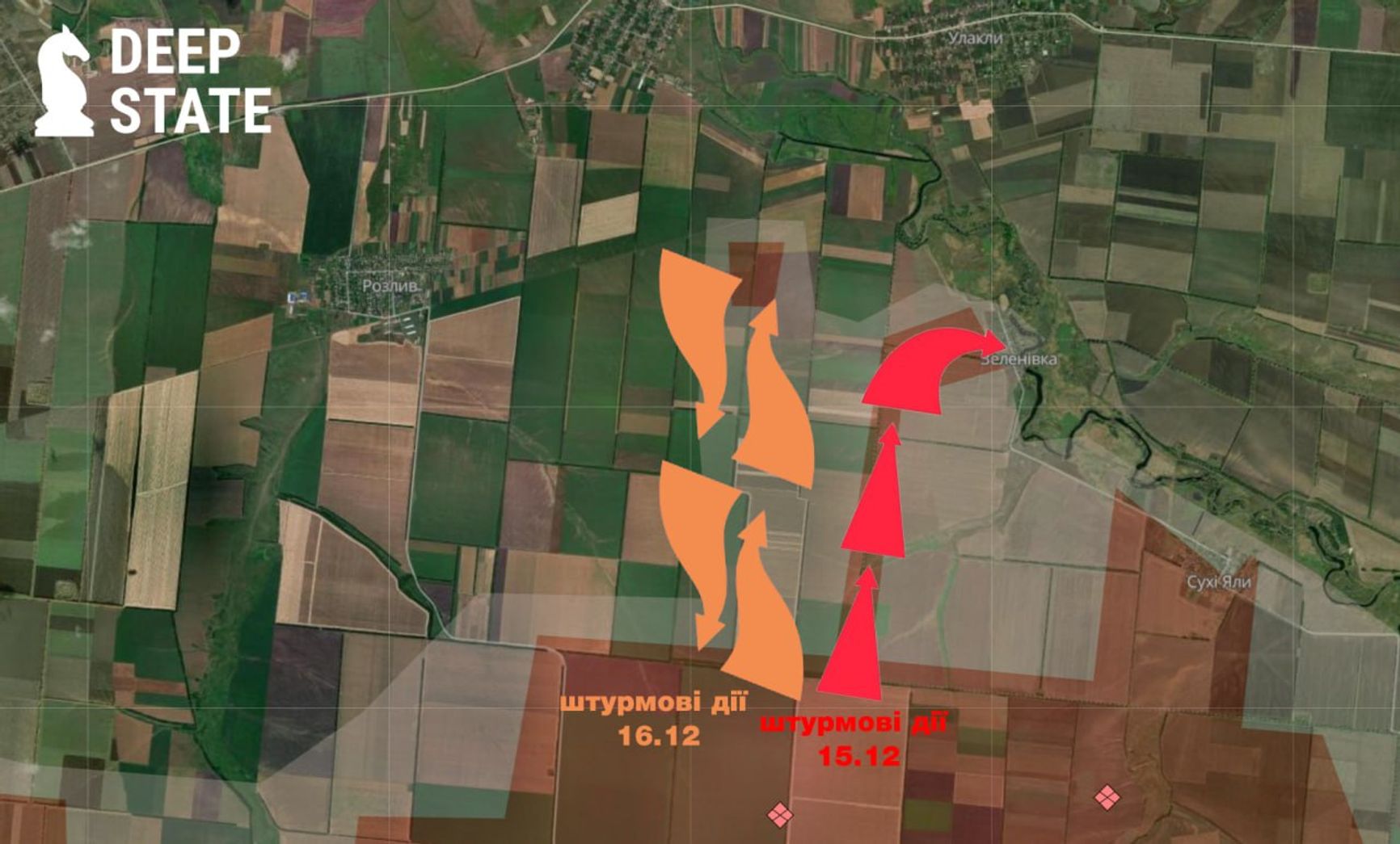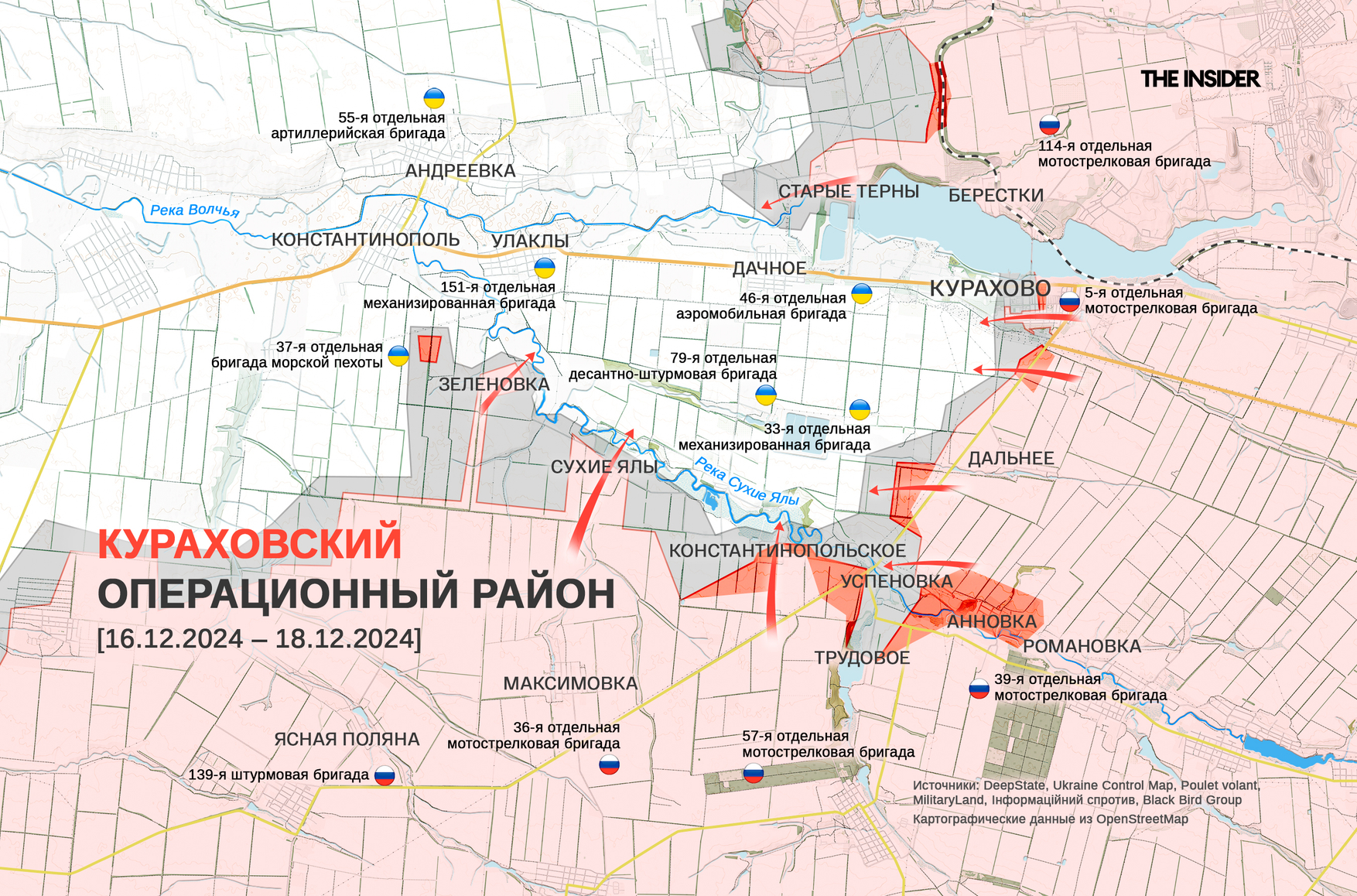 В Кураховском операционном районе DeepState признает захват российскими войсками Сонцовки (до 2016 года — Красное) и продвижение около Берестков на северном берегу Кураховского водохранилища, а также рядом с Зеленовкой и в самом Курахове. Аналитики DeepState отдельно рассказывают об усложнении обстановки около Зеленовки. По их данным, 15 и 16 декабря 2024 года механизированные колонны ВС РФ почти беспрепятственно добирались до поселка и высаживали там группы пехоты.