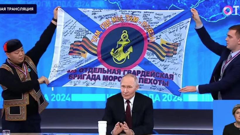 В ходе прямой линии Путин попросил подойти двух человек из зала, вручил им флаг 155-й отдельной бригады морской пехоты.