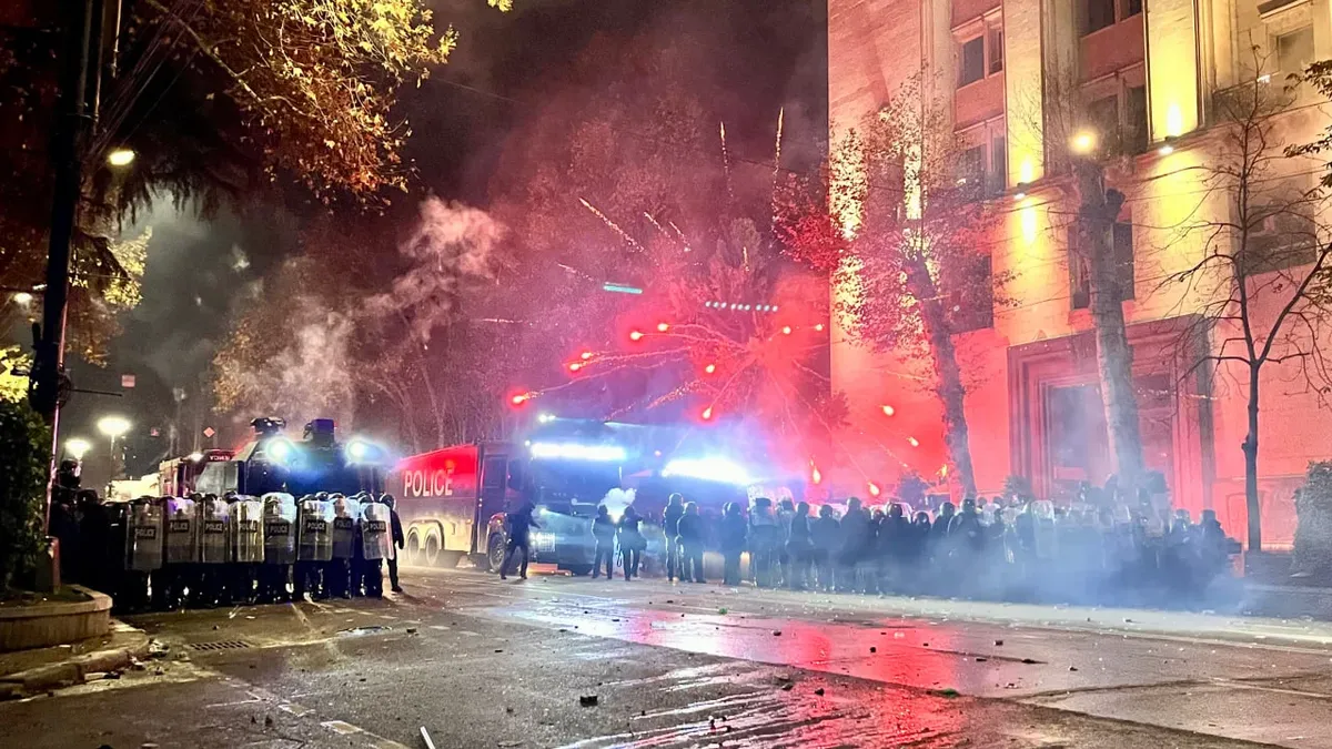 Fireworks explode from behind riot police line in Tbilisi, Georgia, on 30 November. Photo: Nicholas Pearce for Novaya Gazeta Europe