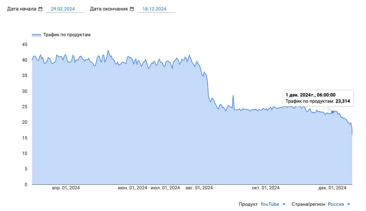 Еще вчера, 18 декабря, трафик видеохостинга в России снизился на 20% по сравнению с предыдущим днем, отметило The Bell. В сравнении с 24 июля, когда YouTube только начали замедлять в стране, падение составило более 60%.