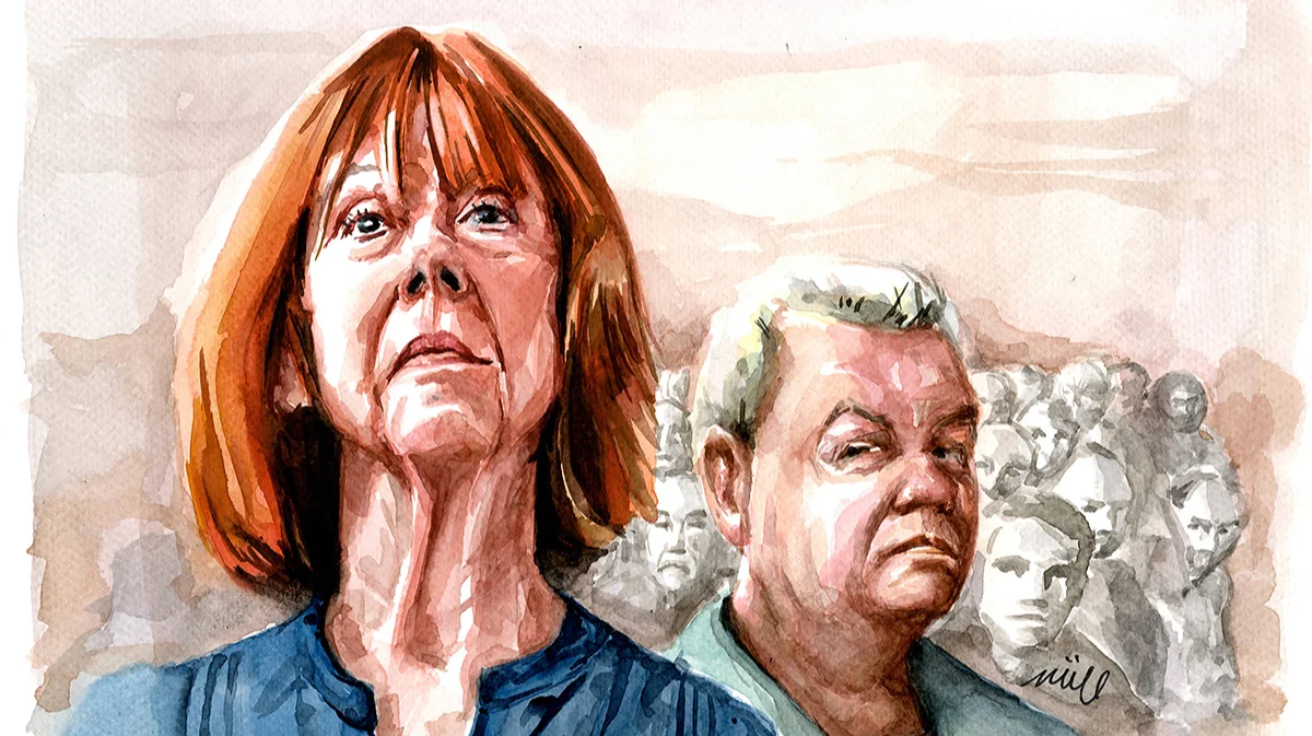 Жизель Пелико, Доминик Пелико и 50 других обвиняемых на рисунке судебного художника. Фото: ZZIIGG / SIPA / Scanpix / LETA