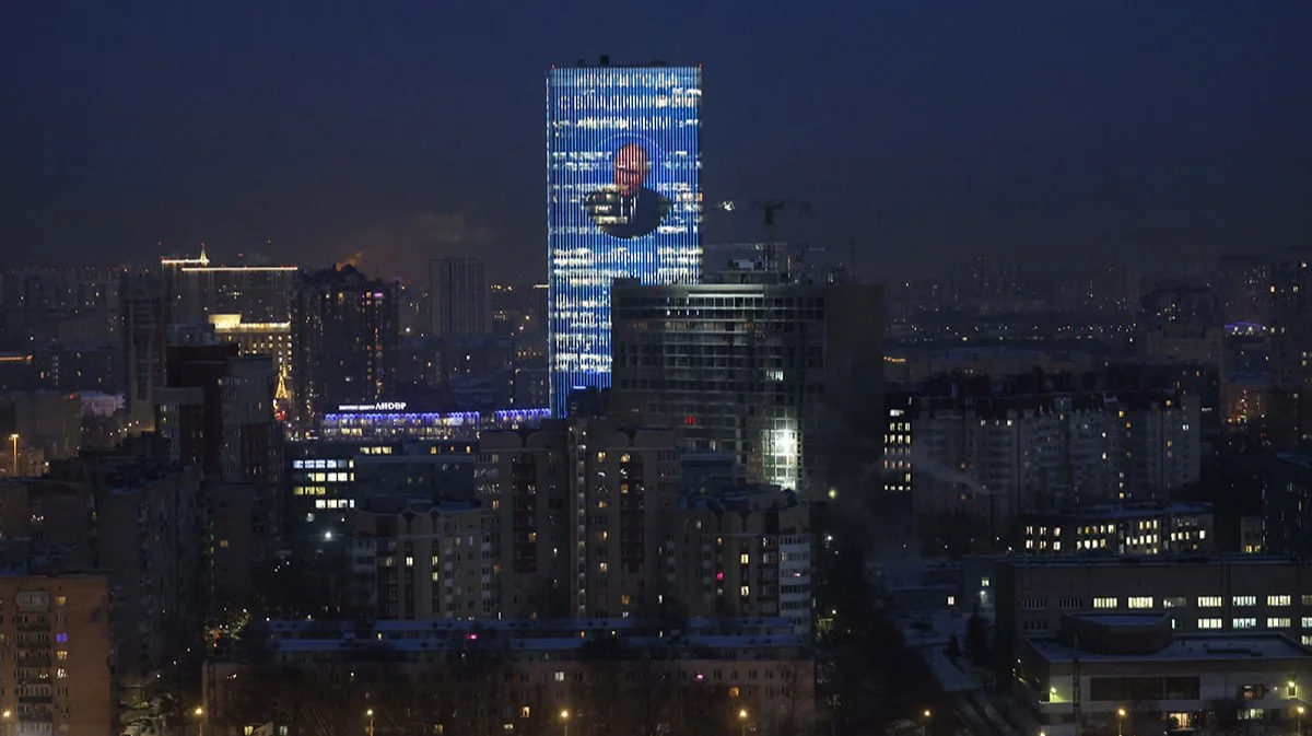 A digital image of Vladimir Putin seen on a business centre building in St. Petersburg, 18 December 2024. Photo: EPA-EFE/ANATOLY MALTSEV
