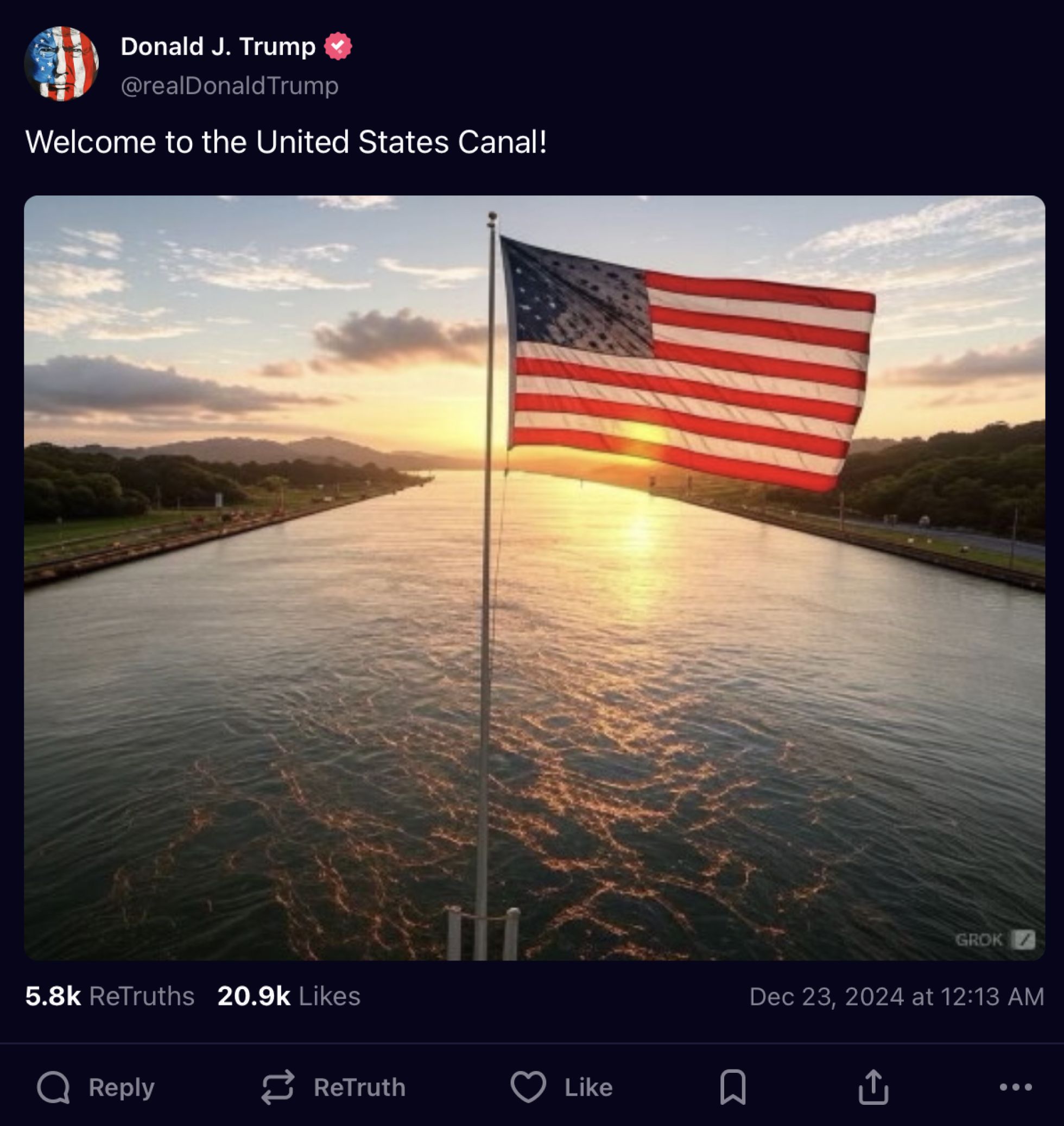 Уже после мероприятия Дональд Трамп опубликовал в соцсети Truth Social фотографию Панамского канала с развевающимся американским флагом (снимок сгенерирован нейроесетью Grok).