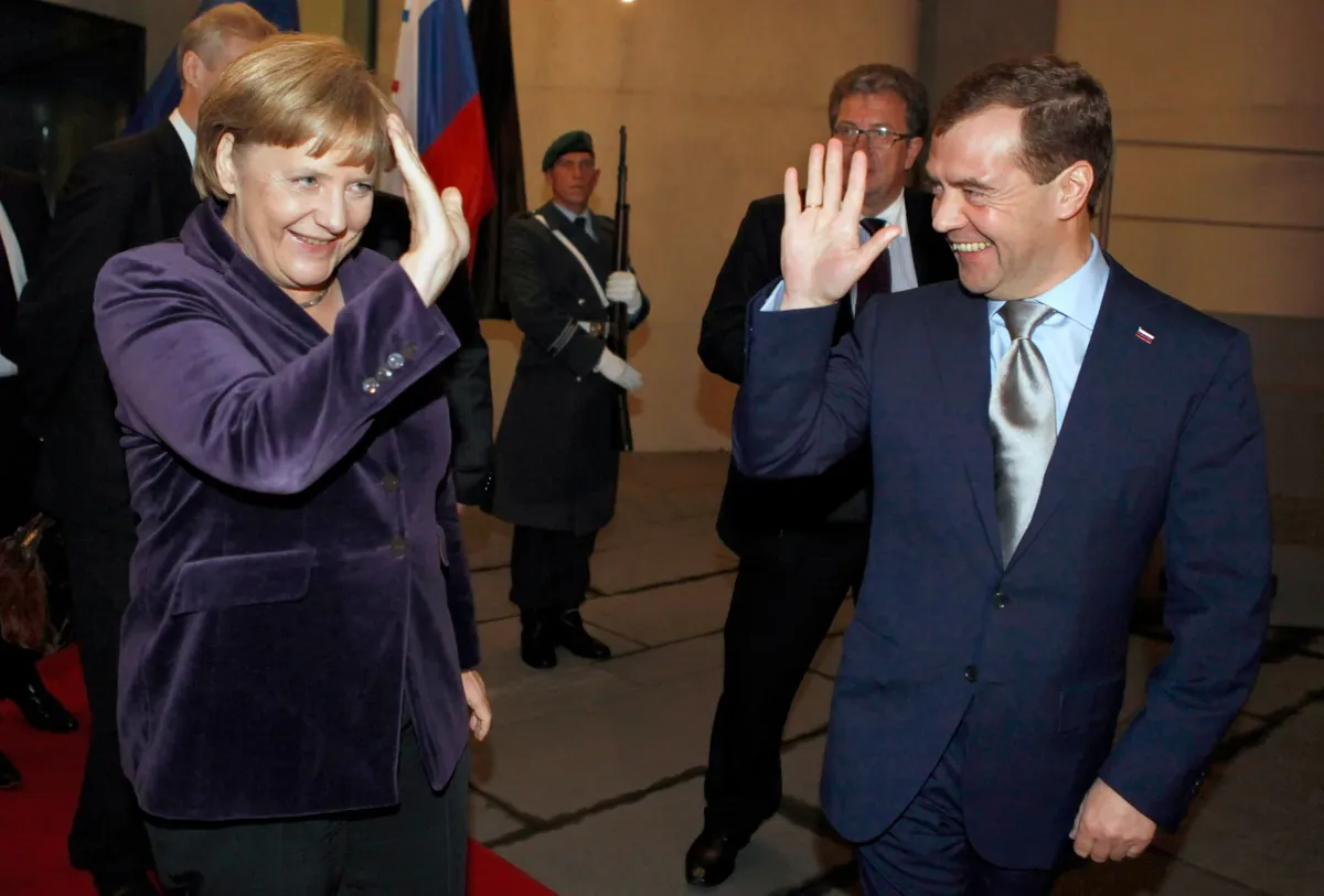 Немецкую и другую западную прессу обошел давний фотоснимок. В центре сюжета Ангела, сияющая счастливой улыбкой, вместе с тогдашним президентом РФ Дмитрием Медведевым, главами правительств Франции и Нидерландов, представителями бизнеса в Лубмине на балтийском побережье Германии торжественно открывает вентиль газопровода «Нордстрим» («Северный поток»).