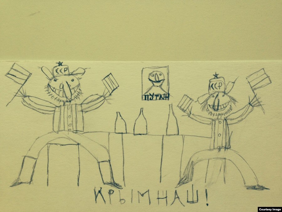 Первый рисунок в наивном стиле, на котором два мужика в ушанках и ватниках пьют водку на фоне портрета Путина, появился на следующий день после аннексии Крыма. После этого художник стал публиковать в сети другие работы.