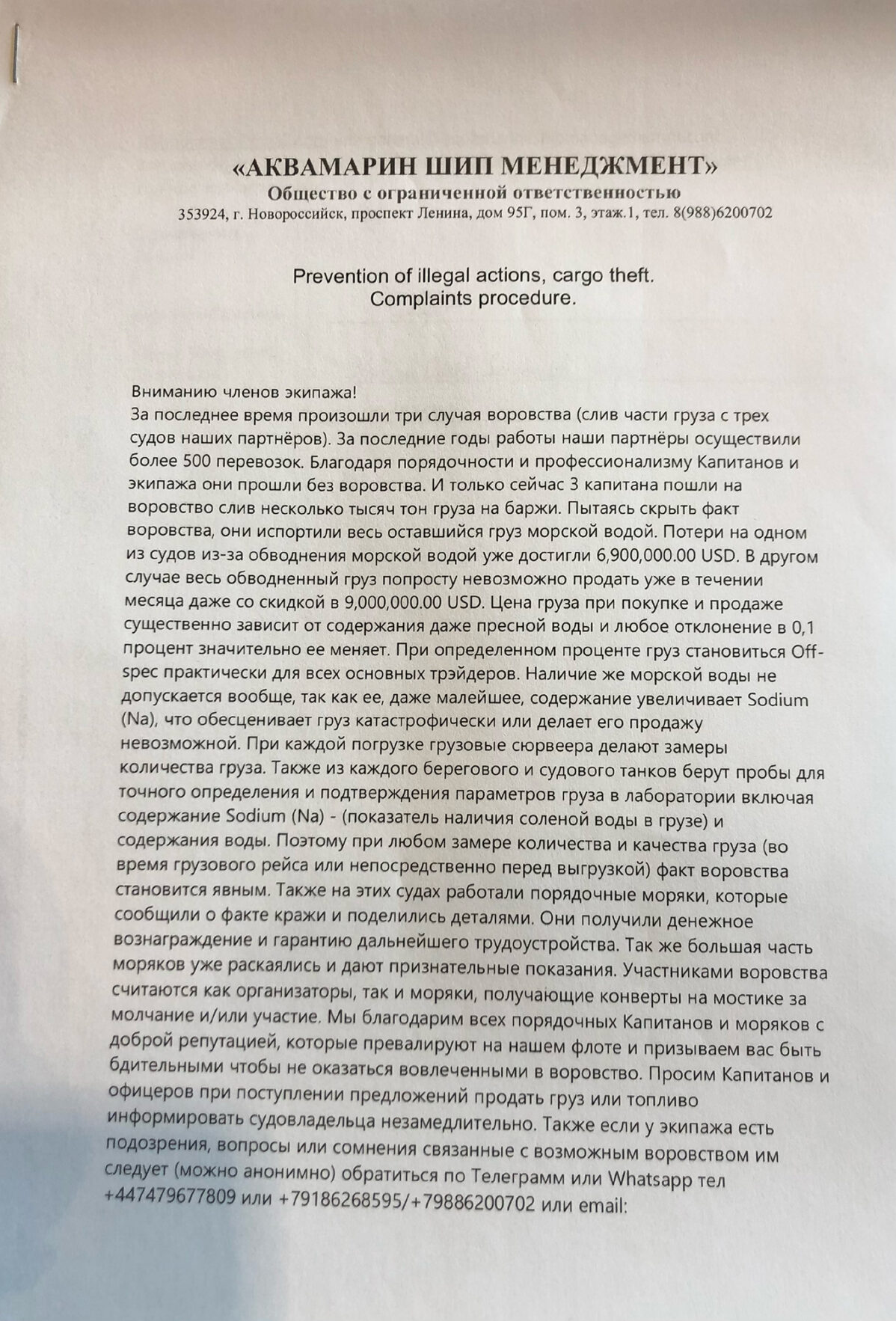 По словам Александр, во время одного из случаев воровства в Zolos примерно два года назад капитан успел «свинтить» и забрал себе большую сумму — более полутора миллионов долларов, а старший помощник — около 800 тысяч. С судна выкачали около 70 тысяч тонн нефтепродуктов. Рядовые получили по 7 тысяч долларов, однако один матрос потребовал 20 тысяч долларов и, оставшись без обещанной доли, раскрыл схему и «всех сдал», что привело к аресту старшего механика.