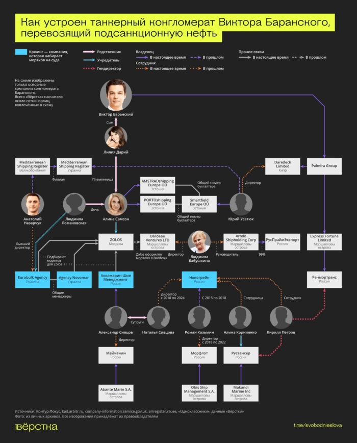 Как выяснила «Вёрстка», Zolos, через который на танкеры набирают моряков — ключевой элемент всей сети организаций, связанных с одесситом Виктором Баранским. В конгломерат, выстроенный вокруг Zolos, входят как украинские крюинги «Евробалк» и «Новомар», так и российские «Аквамарин шип менеджмент», «Новогрейн» и «Новомар Групп-Крюинг». i.