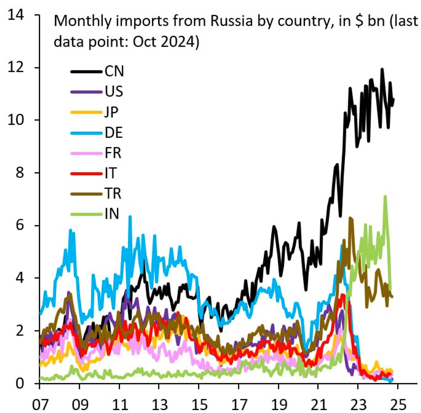 Растет экспорт в Китай и Индию, но это отчасти компенсируется сокращением экспорта в Турцию, а экспорт в страны Запада, некогда бывшие крупнейшими импортерами российской продукции, упал до статистически ничтожных значений.