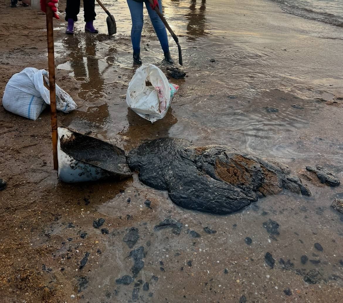 Его друг Дмитрий убирает мазут на пляже в Джемете. Туда спецтехника все же доехала, но "помогла" так, что стало только хуже.