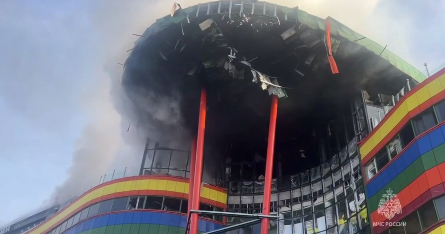 На опубликованных МЧС кадрах с места происшествия видно поврежденный фасад торгового центра в районе последнего этажа.