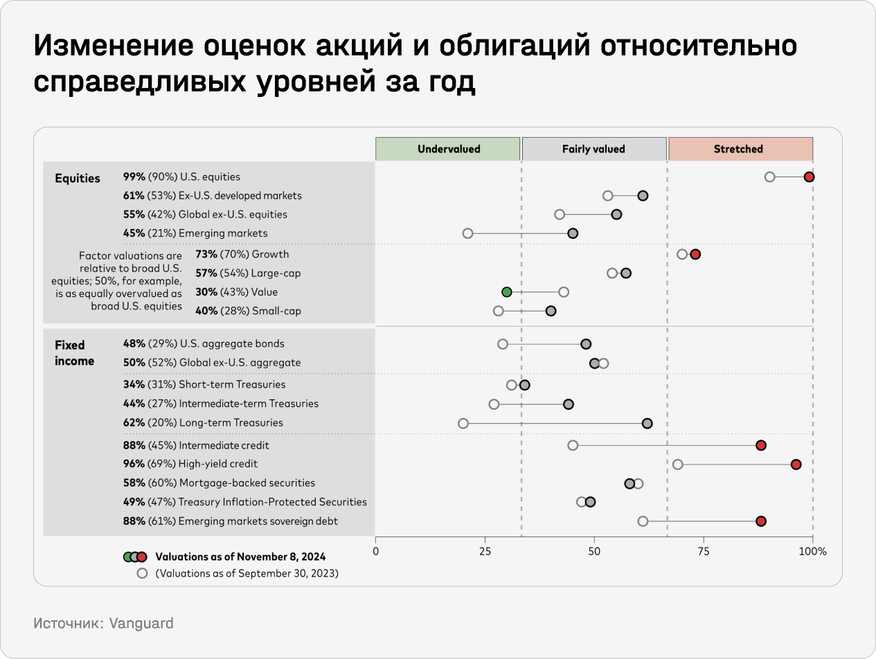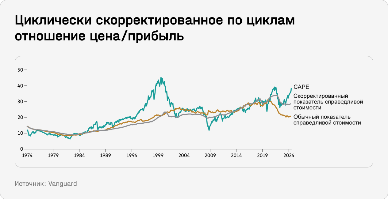 Vanguard рассчитал справедливый показатель CAPE (циклически скорректированное соотношение цена/прибыль) с учетом концентрации рынка и низкой стоимости долга для крупных технологических компаний. В целом CAPE рассчитывается на основании прибылей за 10 лет, а не за один год, что помогает сгладить влияние бизнес-циклов. Текущие оценки на основании рассчитанного Vanguard CAPE оказались на 25% выше справедливых значений рынка вместо 72% для обычного CAPE. Это значит, что возврат к справедливой стоимости не должен привести к значительной коррекции рынка.