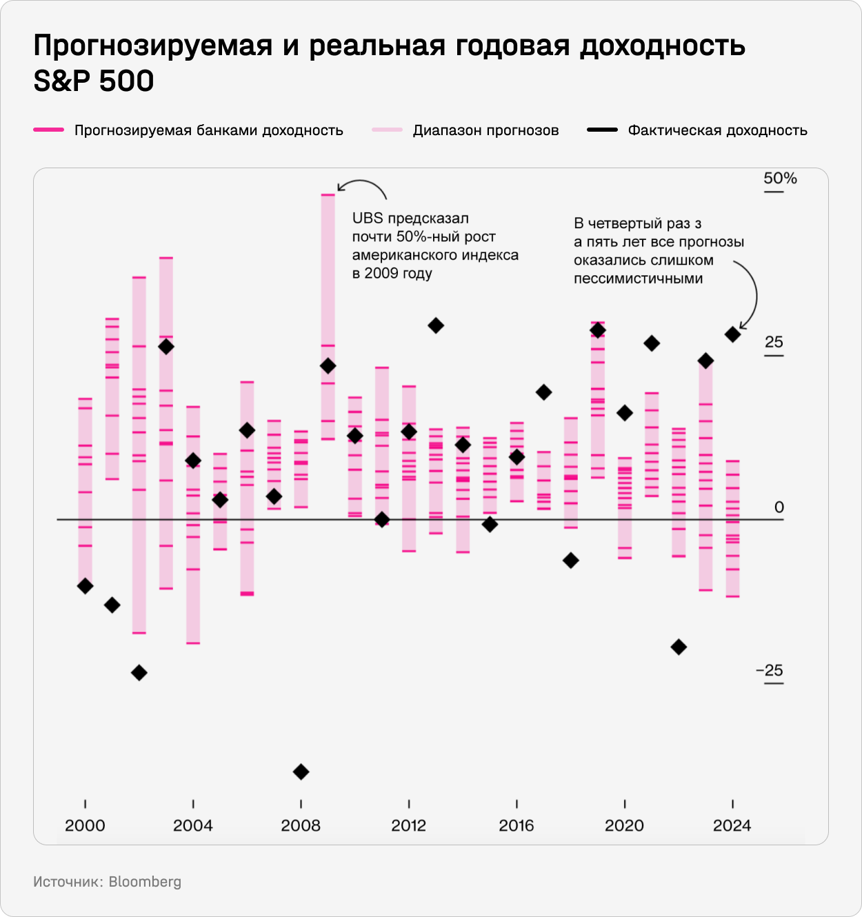 Предсказывать движение рынков в краткосрочной перспективе в целом сложно, но на стратегов действуют и отдельные стимулы. Профессиональные прогнозисты предпочитают диапазон от 0 до 10%, поскольку он соответствует средним историческим показателям, а клиенты могут терпимее отнестись к промаху в среднем диапазоне, чем к экстремальному. «Вы выглядите глупо, если прогнозируете рост на 30%, а рынок падает на 20%. Если вы прогнозируете рост на 10%, а рынок падает на 20%, вам легче найти оправдание тому, почему рынок упал. Вы можете рассказать историю, которая будет звучать хорошо и сохранит вашу репутацию», — цитирует Bloomberg одного из специалистов по финансовому планированию. Сейчас консенсус-прогноз предусматривает рост S&P 500 на 7,5% в 2025-м, а самый «бычий» прогноз — на 17%.