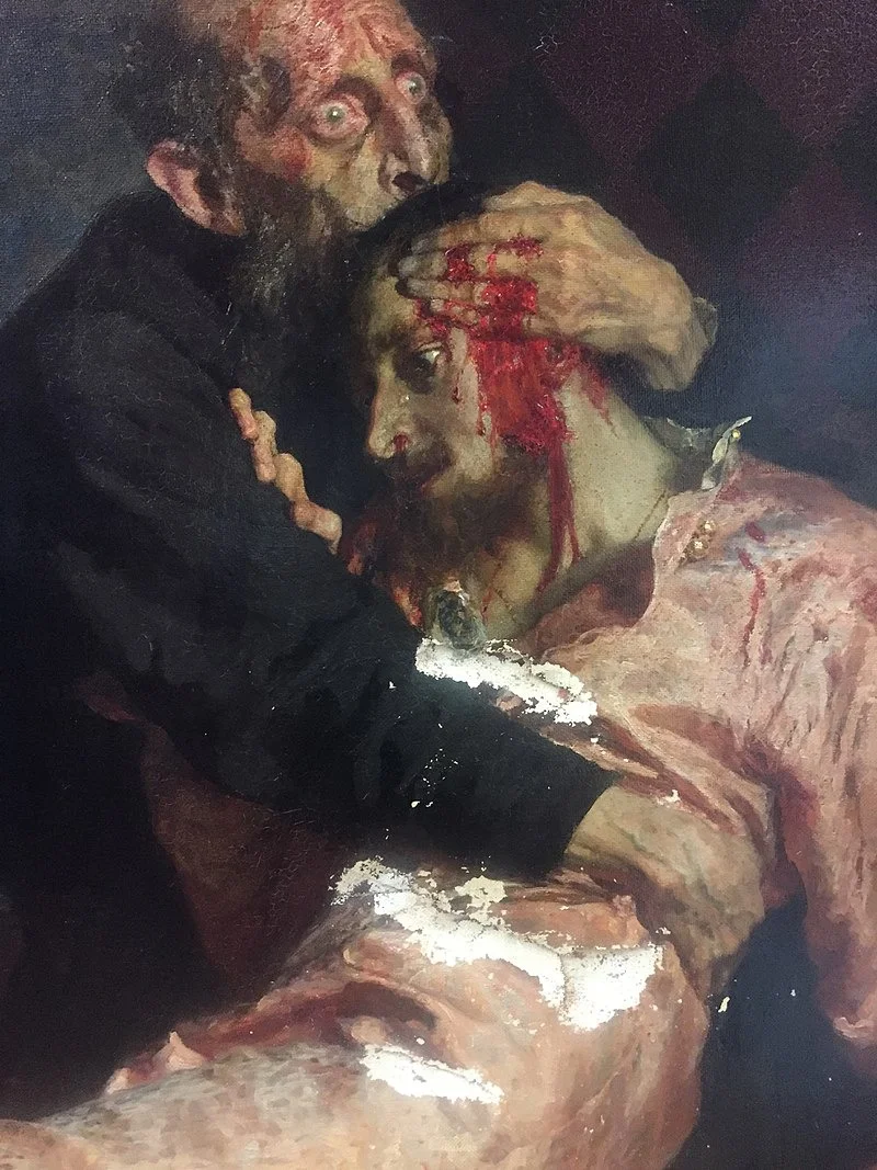 И вот в 2017 году на встрече с рабочими Лебединского горно-обогатительного комбината в Белгородской области президент РФ, оседлав своего любимого конька истории, вспомнил Ивана Грозного и поставил под сомнение версию об убийстве сына, обвинив в ее распространении папского нунция (все та же «заморская клевета»). И можно было бы не придавать значения этим рассуждениям, если бы в следующем году вандал Игорь Подпорин, безработный из Воронежской области, приехавший в Москву на заработки, не совершил повторное нападение на картину Репина. В одном из своих комментариев после задержания он сказал: «Про эту картину я давно уже слышал. Даже Путин по телевизору говорил: то, что на ней, — неправда. И Иван Грозный же — святой. В книгах написано. Года два я уже про это думаю. И тут вот пришел в Третьяковку и не смог сдержаться. Очень меня возмутила картина этого Репина. Иностранцы же туда ходят, увидят такое — и что они про нашего русского царя подумают? И про нас? Это провокация против русского народа, чтобы к нам плохо относились».
