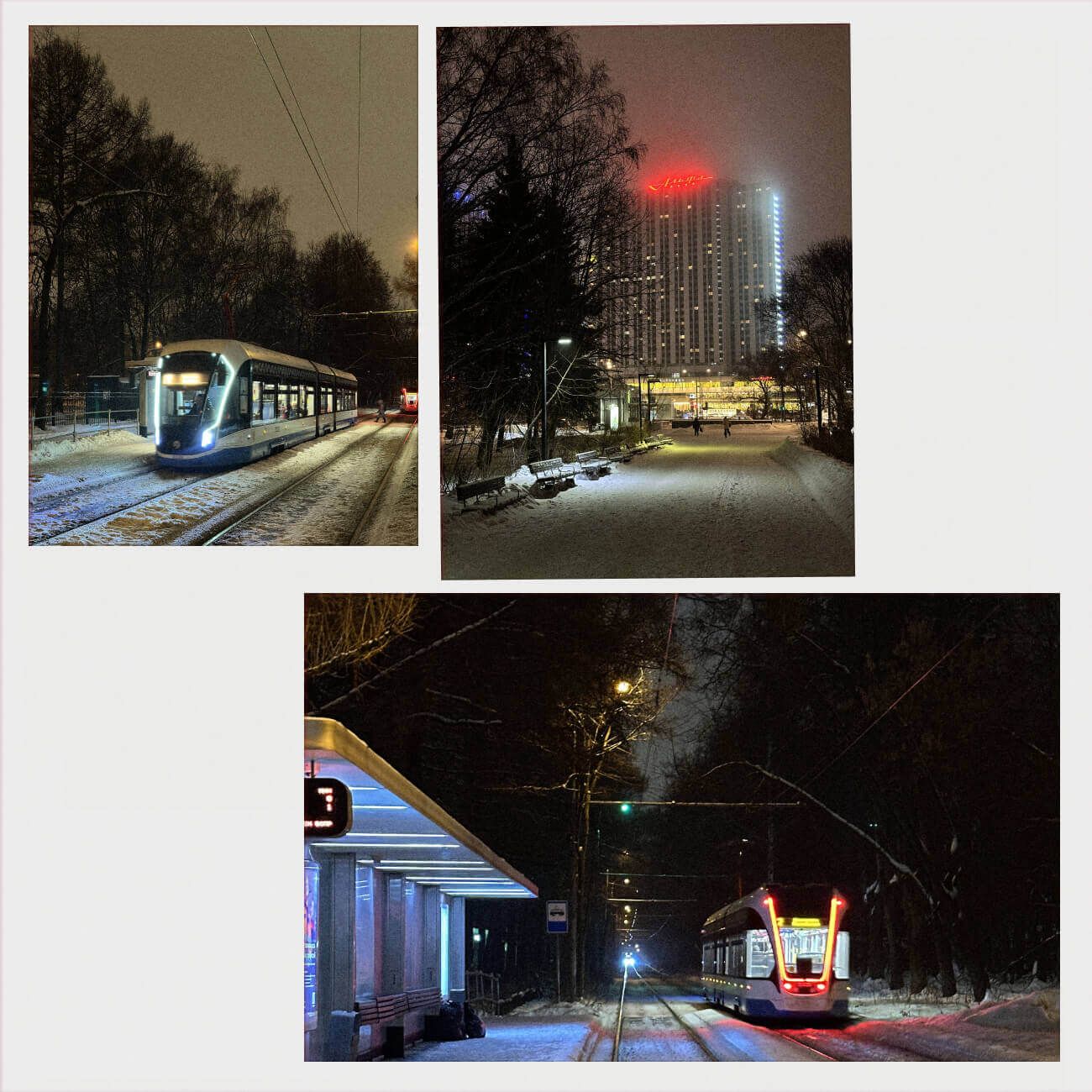 Так удачно получилось, что последние недели я езжу на работу по этому маршруту — на трамвае до «Партизанской», а дальше на метро. Мне удалось сфотографировать, как трамвай подъезжает к остановке примерно в 07:50 утра. На улице было прохладно, а к вечеру пришло потепление — снег начал таять, и никакой новогодней магии не осталось. Возможно, утренний полумрак — это лучшее время для таких фотографий: видно снег, но не видно грязи, что уничтожает новогоднее настроение.