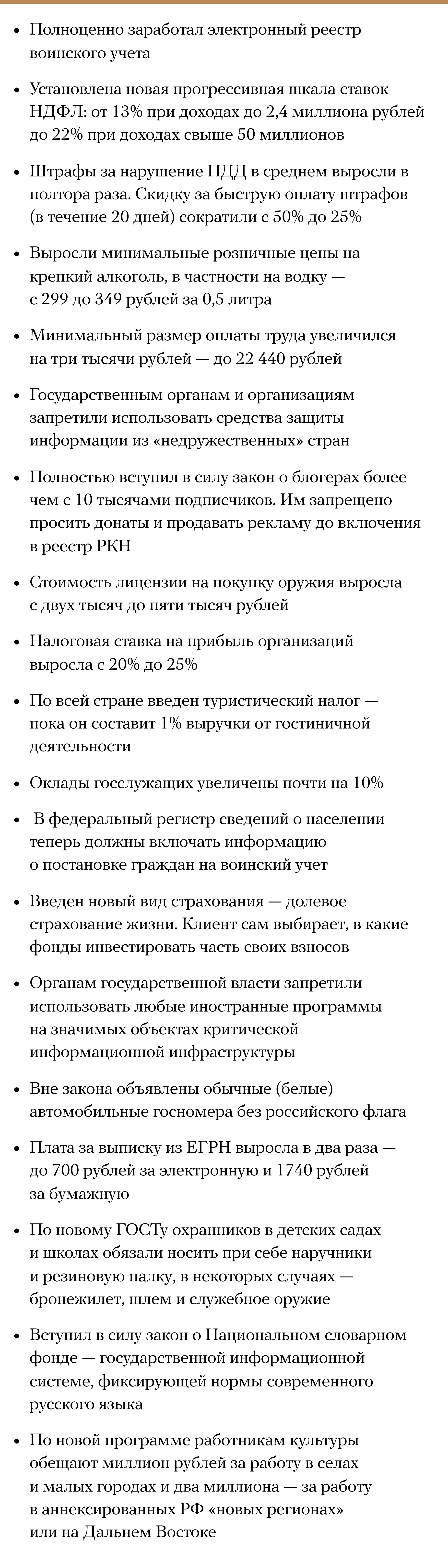 Дата01.01.2025АвторСкрытИсточникМедузаСохранённая копияInternet ArchiveOriginal MaterialShow translationЧто изменилось в России с 1 января 2025 года? В одной картинкеЭлектронные повестки, рост налогов и цен на водку, повышение штрафов и другие нововведения «Медуза»