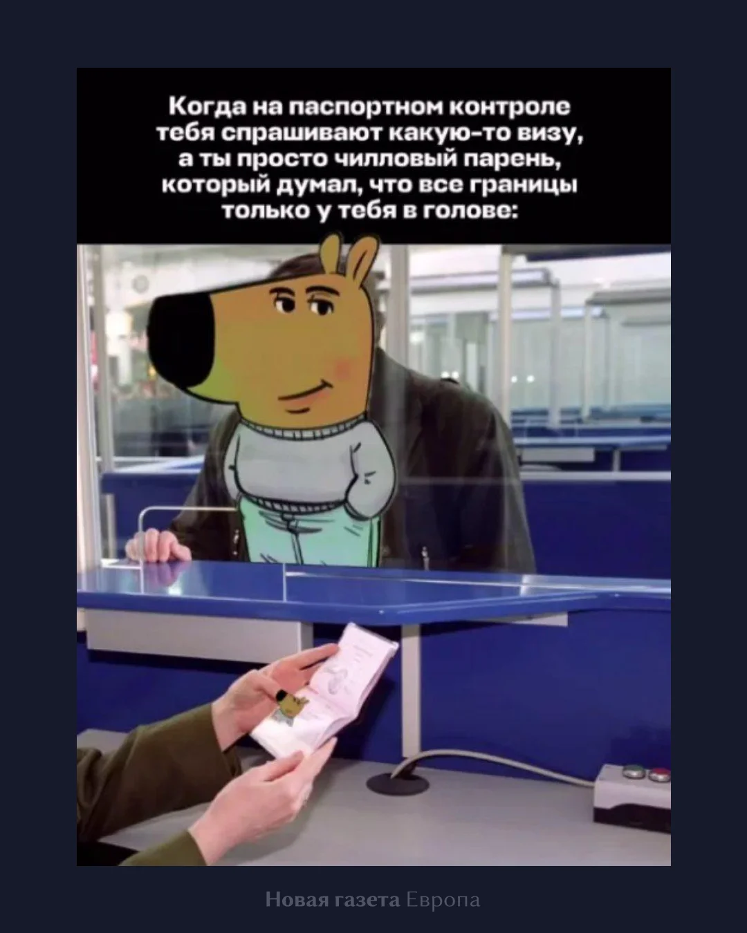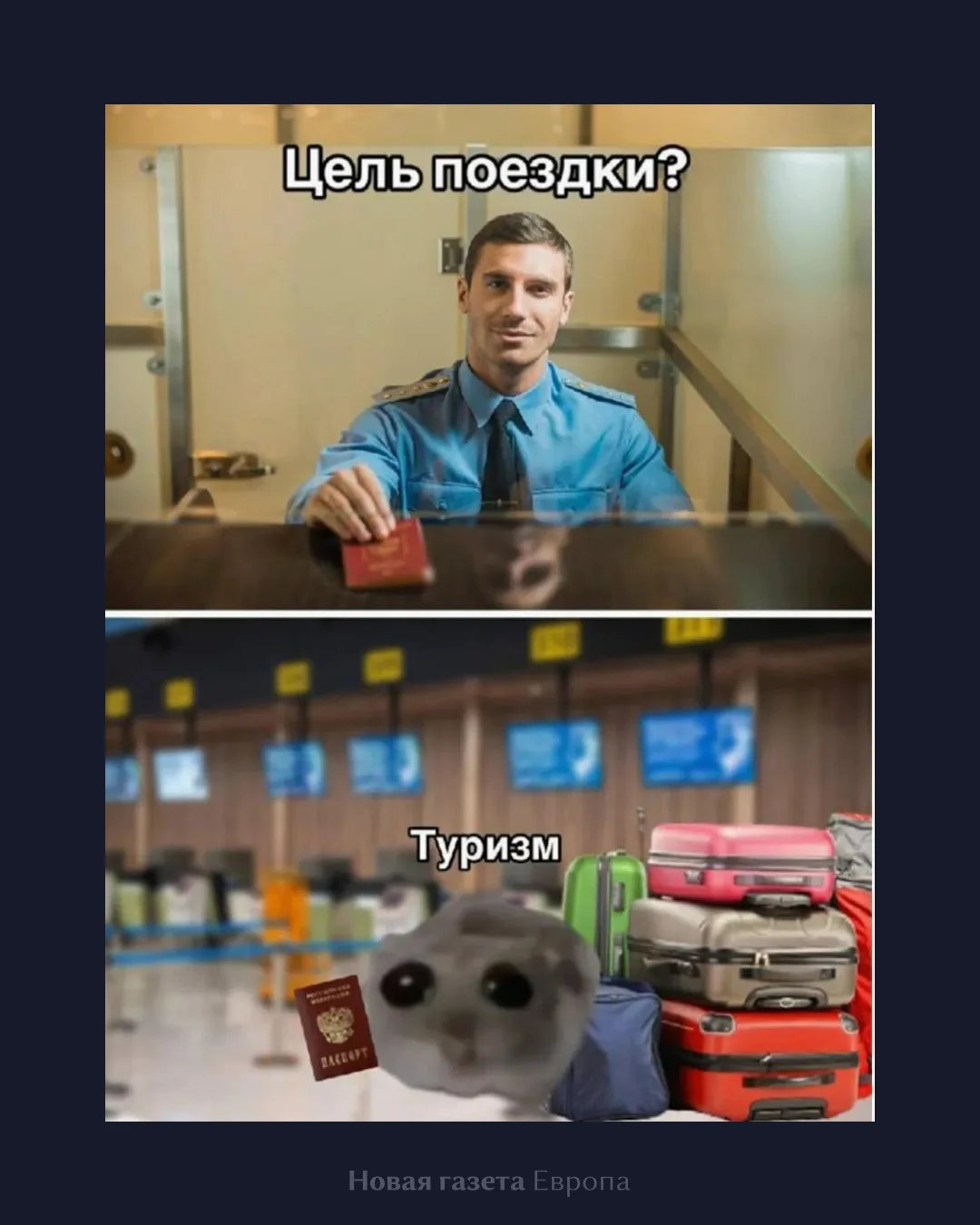 Или о ситуации на границе, когда человек с российским паспортом, несколькими чемоданами и буквально всем домом внутри них подходит к пограничнику и со слезящимися глазами говорит, что цель его поездки — туризм.