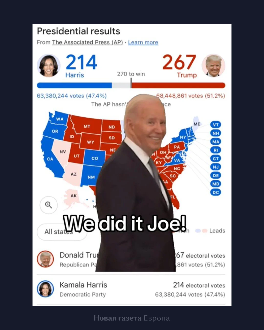 На фоне выборов в США в этом году быстро распространялись мемы о возрасте и физическом состоянии нынешнего президента Джо Байдена — еще до того, как сторонники стали признавать, что ему стоит выйти из гонки. И они были популярны до того момента, когда место кандидата от демпартии заняла Харрис. После этого Байден на публике стал многим казаться бодрее, оживленнее и веселее, и это вызвало конспирологические теории.
