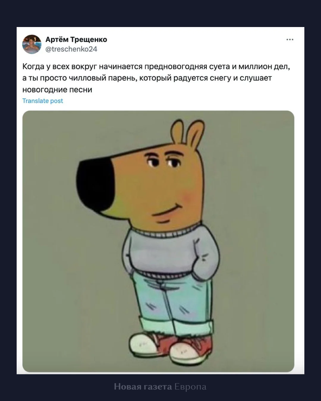 Хит конца осени — начала зимы — просто чилловый парень. Беспечный мультяшный пес в кедах, с руками в карманах и невозмутимой улыбкой на морде просто живет эту жизнь. Никаких гонок и конкуренции, никакого волнения — он просто just a chill guy (или чилловый, расслабленный парень). И это чрезвычайно популярный мем с конца осени — что в англоязычном, что в русскоязычном интернете.