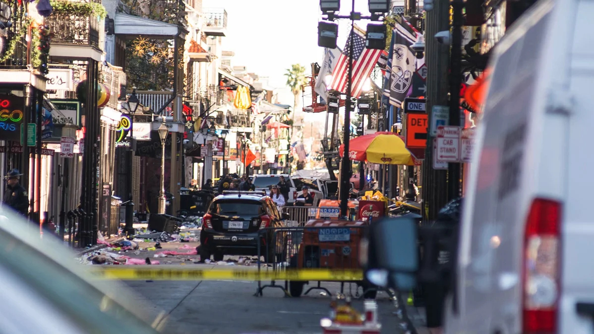 Полицейские работают во Французском квартале после того, как автомобиль въехал в толпу людей, Новый Орлеан, Луизиана, США, 1 января 2025 года. Фото: Shawn Fink / EPA