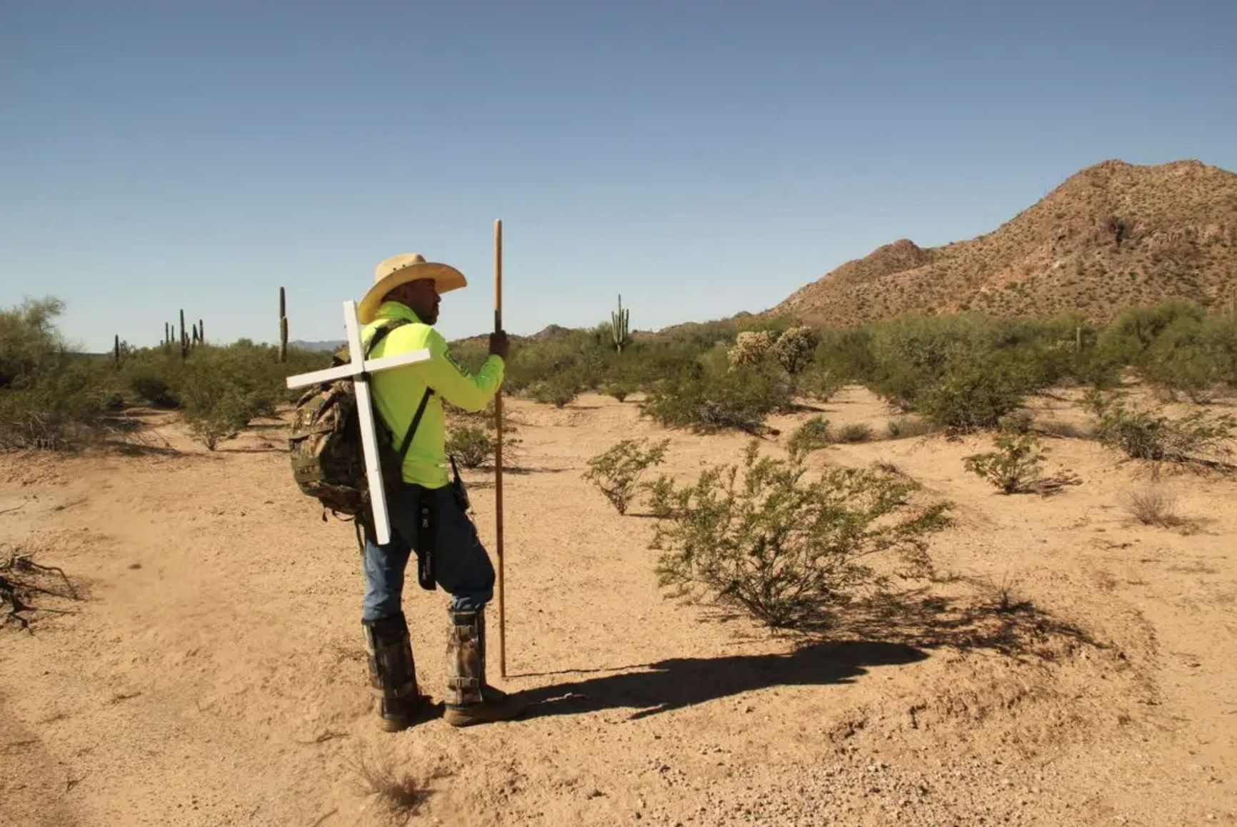 Один из волонтеров «Орлов пустыни». Когда члены организации находят тела погибших мигрантов, в знак уважения на этом месте оставляют крест / Smithsonian magazine, Henri Migala
