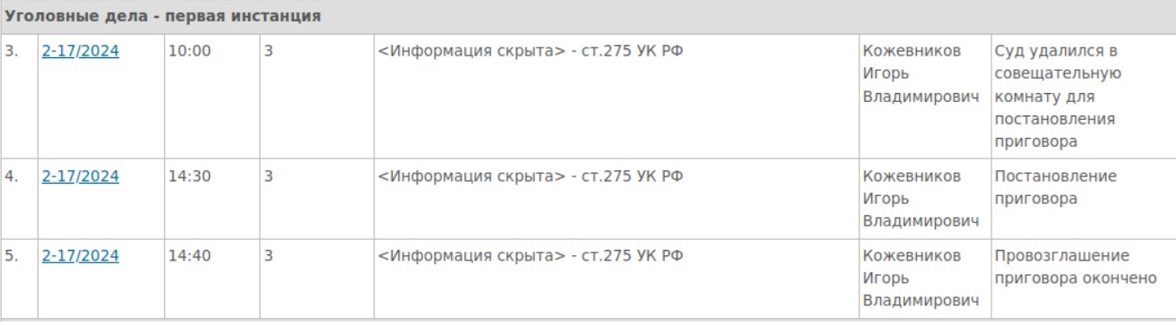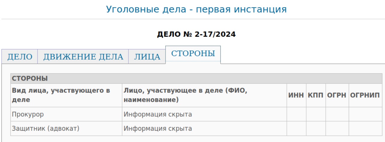 Остальная информация по делу засекречена. Скрыты не только фамилия подсудимой, но и прокурора и защитника.