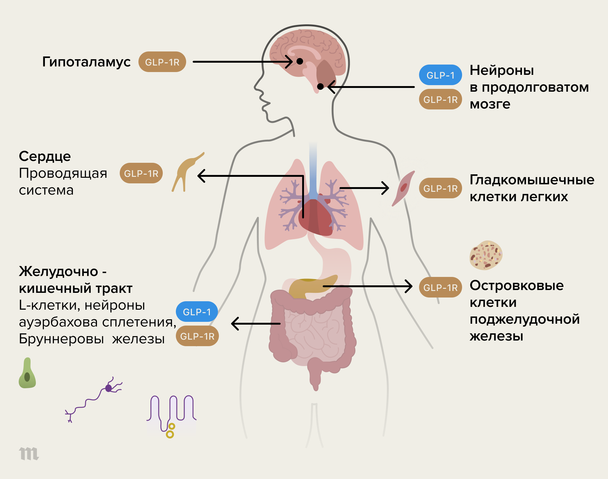 Дело в том, что рецепторы, на которые такие препараты воздействуют, присутствуют во многих тканях — в кишечнике, в поджелудочной железе, в сердце, на кровеносных сосудах, в печени, в легких и даже в мозге. Схема с контролем уровня глюкозы, которая изложена выше, в реальности, конечно, гораздо сложнее. Дело в том, что помимо L-клеток кишечника GLP-1 вырабатывается также в мозге и играет там, по-видимому, совершенно отдельную, пока слабо изученную роль. А вот внемозговой гормон в мозг, судя по всему, не попадает.
