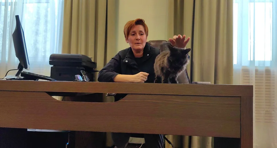 Все время, пока мы разговариваем, котенок с трассы продолжает бегать по кабинету. Он роняет камеру, точит когти о кресло, мурлыкает и громко мяукает, привлекая к себе внимание. Татьяна комментирует его проделки: нецензурно, но умильно. Внезапно котенок останавливается, прижав уши и вытаращив глаза. В центр заходит женщина со щенком дворняги, которого принесли ее дети.