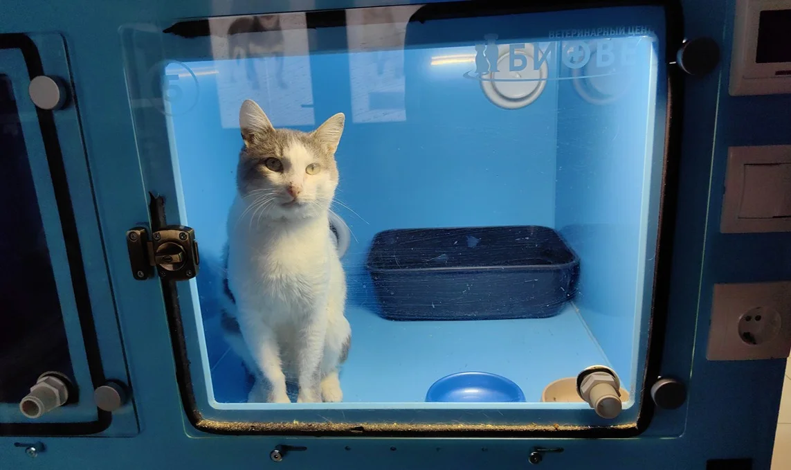 ЦЛС внутри кажется просторнее, чем снаружи. Большое светлое помещение со свежим ремонтом состоит из трех секций. Общий зал заставлен клетками и упаковками с кормами. Дальше — небольшая, больше похожая на кухню хрущевки, операционная, где по ту сторону стеклопакета в ожидании то ли вискаса, то ли зрелищ сидит большой темно-серый кот.