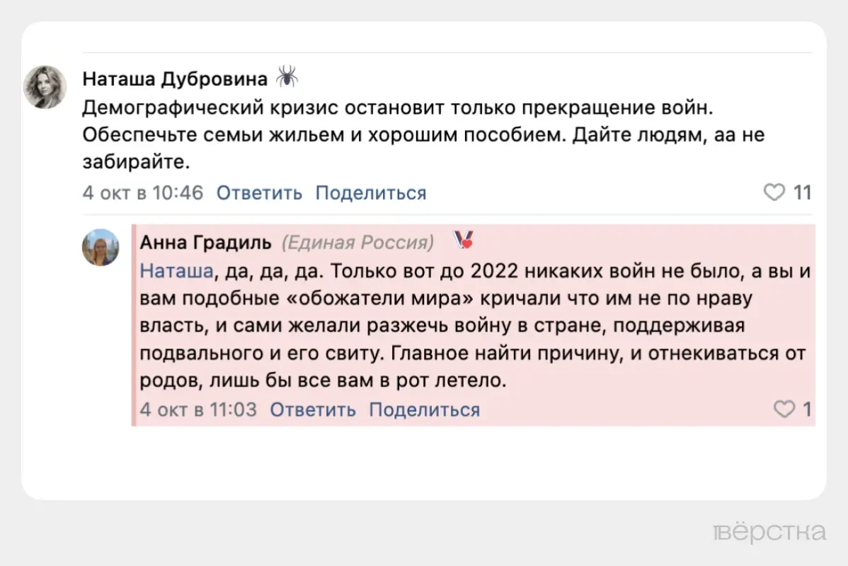 «Если зп не устраивает, при чем правительство? Возьми и смени работу на более оплачиваемую», «Чайлдфри и вопрос про цены на квартиры — совершенно разные области», «Что, картофельные очистки доедаешь на улицу выйти боишься и работы нет? Каждый кузнец своего счастья. Надо начинать менять свою жизнь», «Если тебе детские пособия говорят не рожать детей, то это уже надо в психиатрию», — писали провластные боты в ВК.