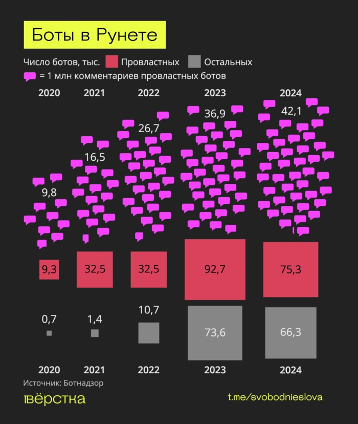 На 2024 год пришлось рекордное количество комментариев ботов в ВК — более 42 млн, следует из данных проекта «Ботнадзор», которые проанализировала «Вёрстка». Для сравнения, в 2023 году боты оставили почти 37 млн комментариев, в 2022 — 26,7 млн, а четыре года назад — в 2020 году — около 10 млн.