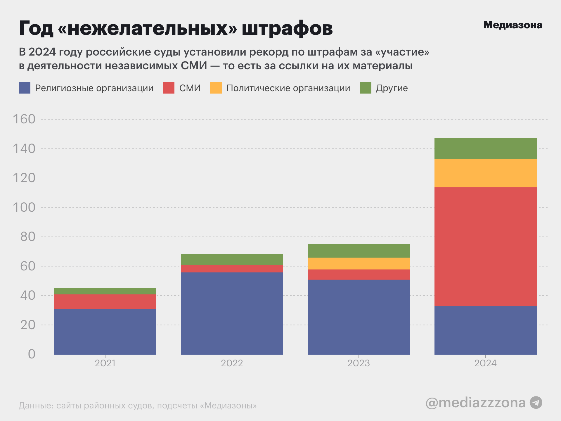 Независимые СМИ вышли в лидеры по «нежелательным» штрафам, потеснив религиозные организации («Возрождение», «Фалуньгун», «АллатРа» и другие), за участие в которых массово штрафовали в прошлые годы.