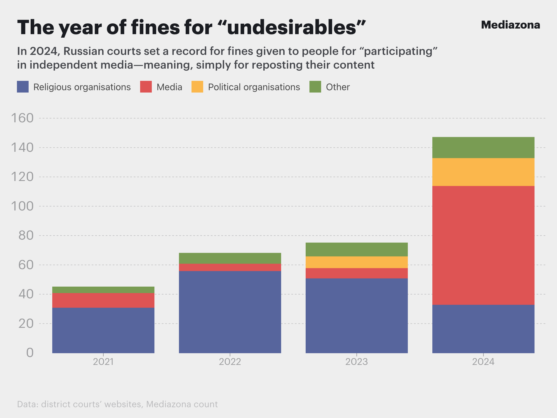 Independent media have now surpassed religious organisations (such as Falun Gong, AllatRa, etc.) as the primary targets of “undesirable” fines—those groups were heavily fined in previous years. 2024 was also a record year in terms of the number of fines: the courts handed down 178 such rulings, 147 of which have been made public.