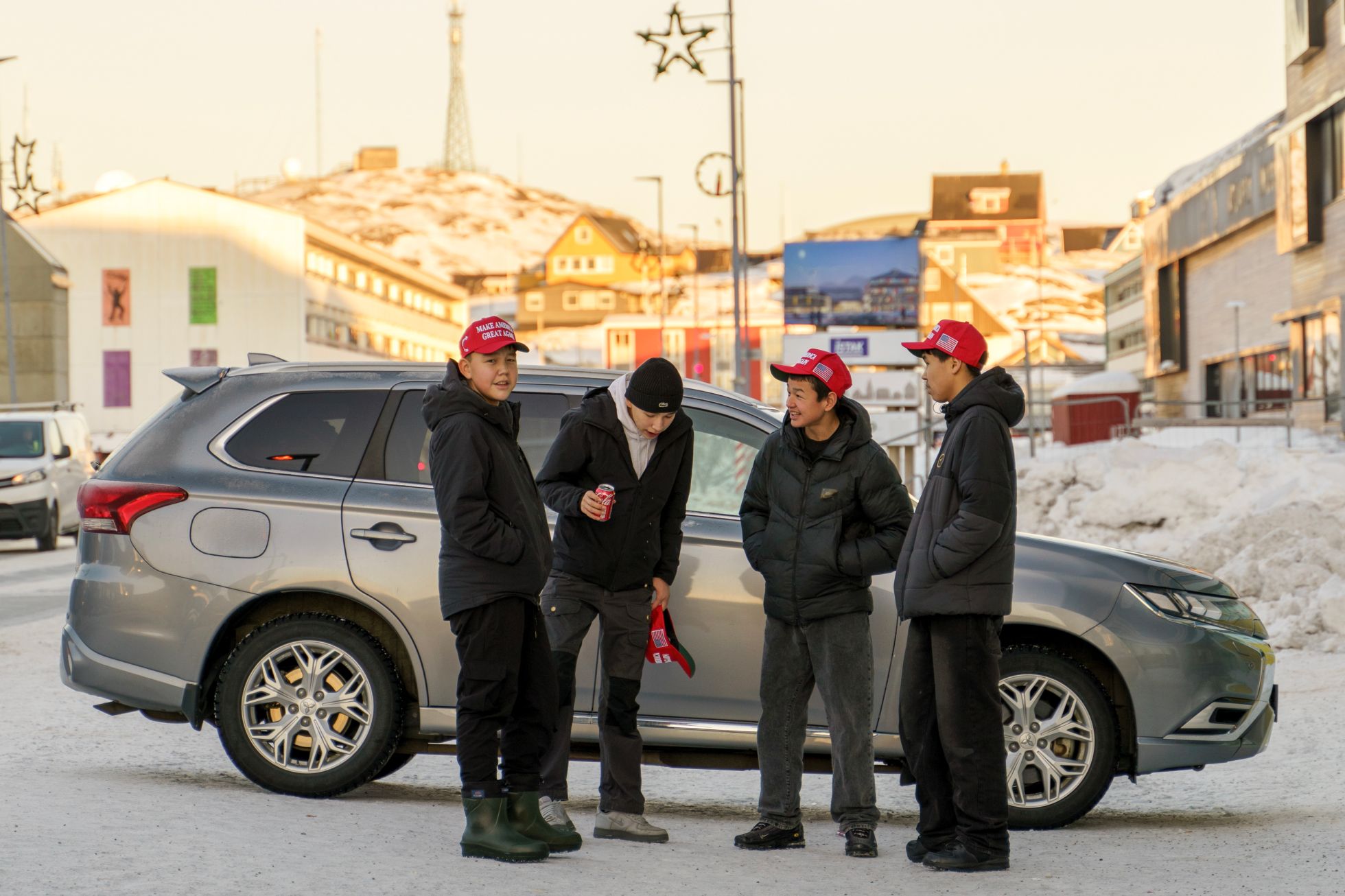 Daniel L. Johnsen / EPA / Scanpix / LETA Гренландцы в кепках с трамповским слоганом «Make America great again» в Нууке рядом с гостиницей, где остановился Дональд Трамп — младший во время визита в Гренландию 7 января 2025 года