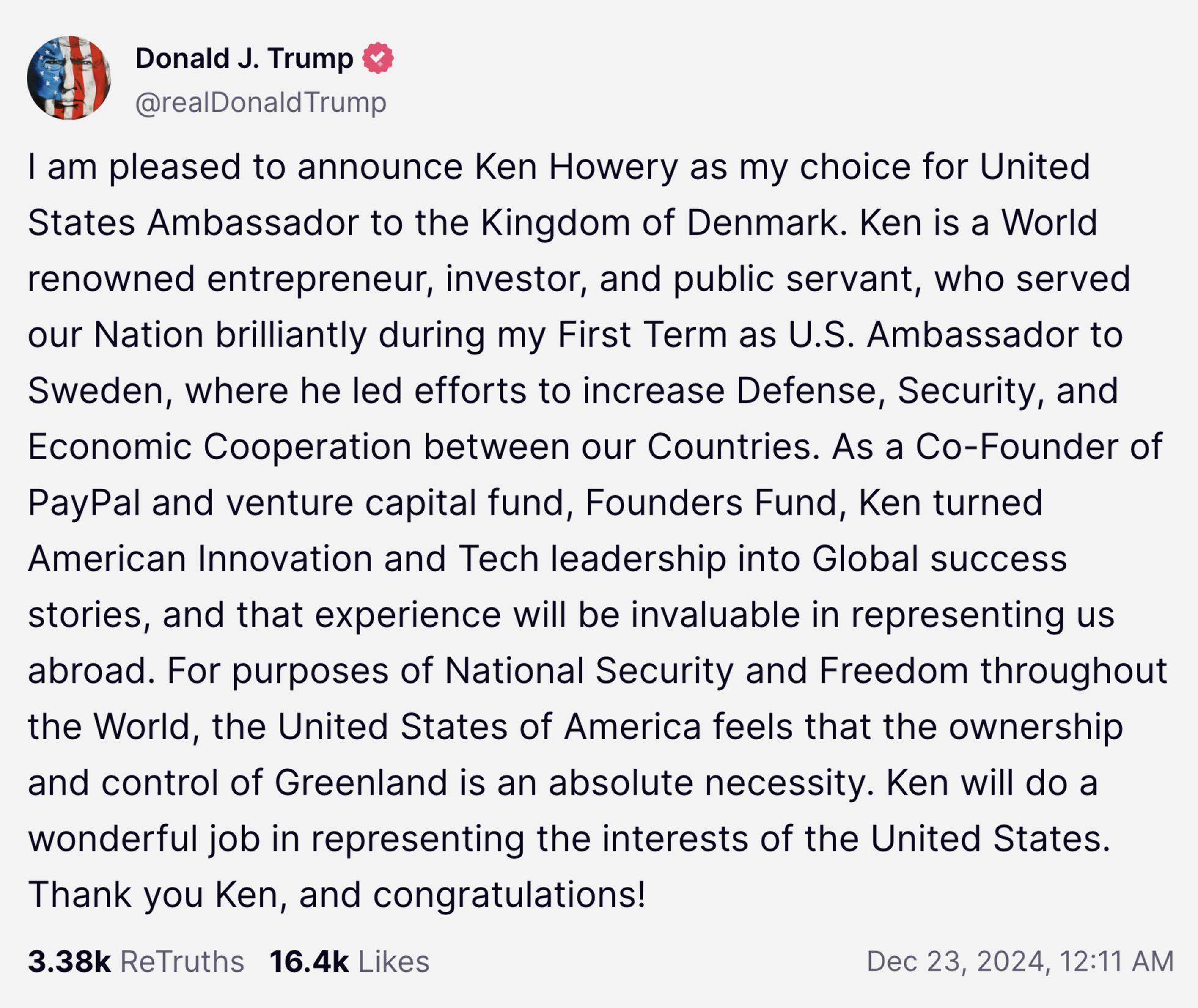 Тем временем добавился «гренландский» скандал. 23 декабря Трамп объявил, что, когда вступит в должность президента, назначит послом США в Дании Кена Хаури. И зачем-то добавил: «Для целей национальной безопасности и свободы во всем мире Соединенные Штаты Америки считают, что владение и контроль над Гренландией — абсолютная необходимость».