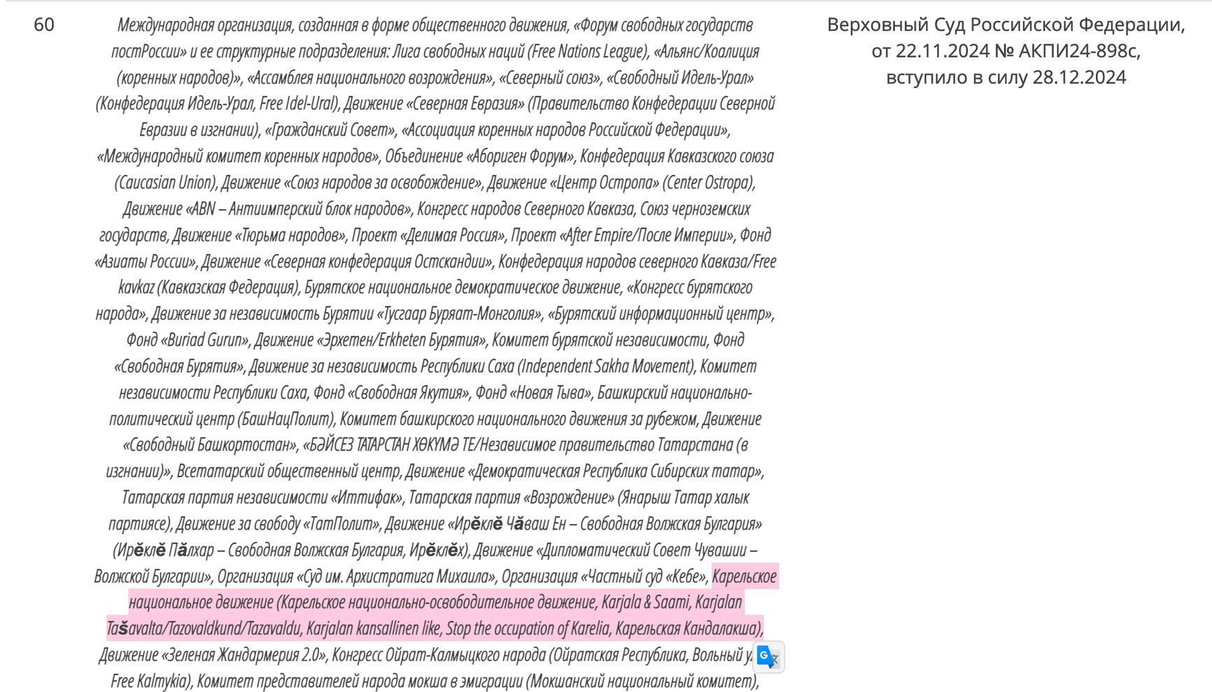 ФСБ внесла в список террористических организаций Республику Карелия. А точнее — ее названия на карельском языке. В список внесли организацию «Форум свободных государств постРоссии» и ее «структурные подразделения», затем после двоеточия перечислены различные названия, в том числе — «Карельское национальное движение». Далее в скобках идет перечисление неких наименований. Почему-то среди них указаны названия Республики на карельском языке и его ливвиковском наречии.
