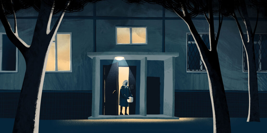 В 2:21 ночи 25 июля камера видеонаблюдения засняла, как пенсионерка в платочке и синем дождевике волокла по лестнице объемный сверток. Через 10 минут она вернулась, а еще через четыре минуты спустилась вновь — в руках тащила хозяйственную сумку. В 3:54 пенсионерка снова появилась в поле зрения камеры — на этот раз с металлической кастрюлей, накрытой белой крышкой. Перед выходом она поставила кастрюлю на пол, чтобы нажать на кнопку и открыть дверь.