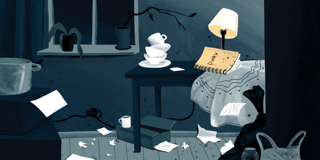 Квартира была завалена вещами: все поверхности занимали коробки, пакеты, одежда, бумаги. На столе у окна стояли горшки с почти завядшими цветами. В помещении неприятно пахло.