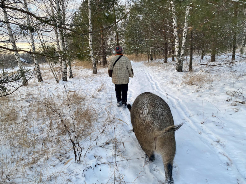 Панкова каждый день выводит их на двухчасовую прогулку, выглядит это так: невысокая женщина спокойно гуляет по полю, а вокруг нее носятся три кабана. Иногда они подрывают рылом землю в поисках корешков, летом любят валяться в лужах. Заигравшись друг с другом, они могут забежать далеко и даже скрыться из поля зрения — но потом всегда возвращаются обратно к Надежде.