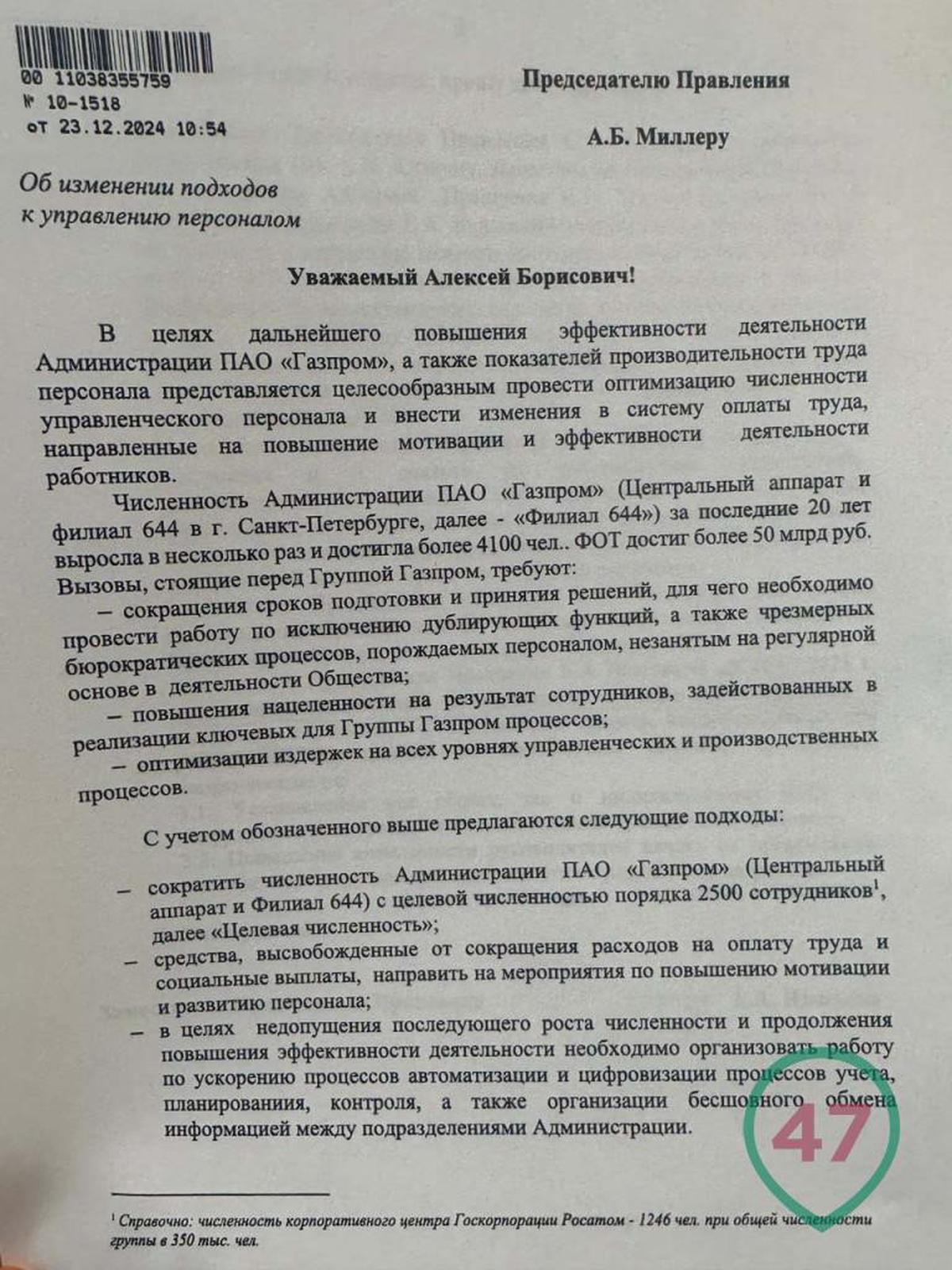 В документе говорится, что сейчас численность управленческого персонала в «Газпроме» превысила 4100 человек, а фонд оплаты труда достиг более 50 млрд рублей. Илюхина предложила сократить центральный аппарат до 2500 человек, то есть более, чем на 1600 позиций.