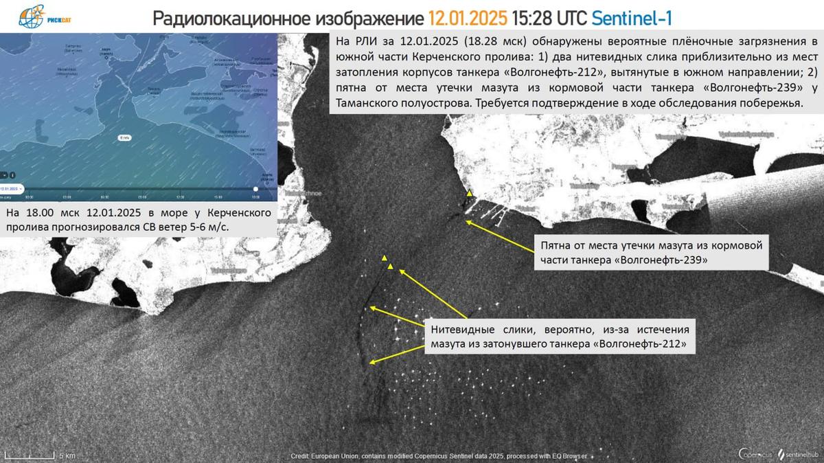 У танкера «Волгонефть-212» образовались два нефтяных слика (так называют пленку, которая образуется на поверхности воды при попадании туда нефти) длиной более 12 км. В районе крушения «Волгонефти-239» у Таманского полуострова также обнаружили новые загрязнения. «РискСат» предполагает, что часть из них находится внутри плавучих заграждений вокруг места аварии.