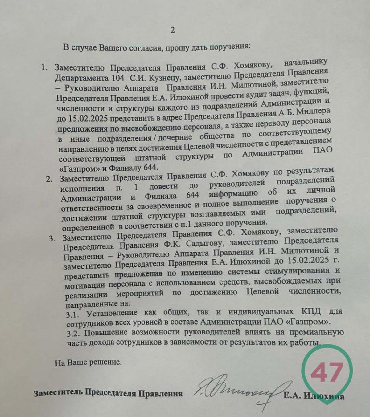 Зампред правления «Газпрома» Елена Илюхина направила главе холдинга Алексею Миллеру предложение о сокращении управленческого состава на 40%. Изначально об этом сообщило издание 47news, которое также опубликовало сам документ. Позже информацию подтвердил ТАСС официальный представитель компании Сергей Куприянов. От прочих комментариев он отказался.
