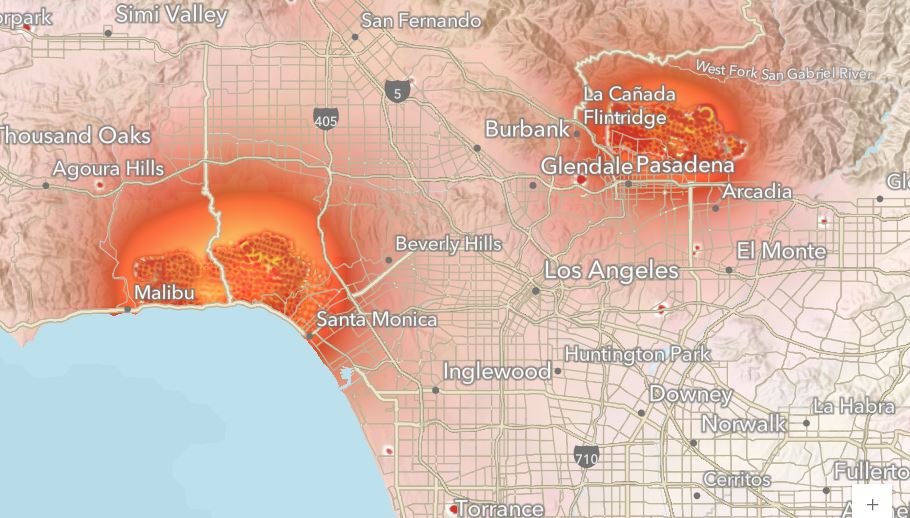 Площадь двух крупнейших пожаров – в прибрежном районе Пасифик-Палисейдс и в северо-восточном пригороде Пасадена – достигла 153 квадратных километров. Почти за неделю борьбы первый удалось локализовать на 11%, второй – на 27%. В тушении огня участвуют более 14 тысяч пожарных, в том числе из Мексики, 1400 пожарных машин и 84 самолёта.